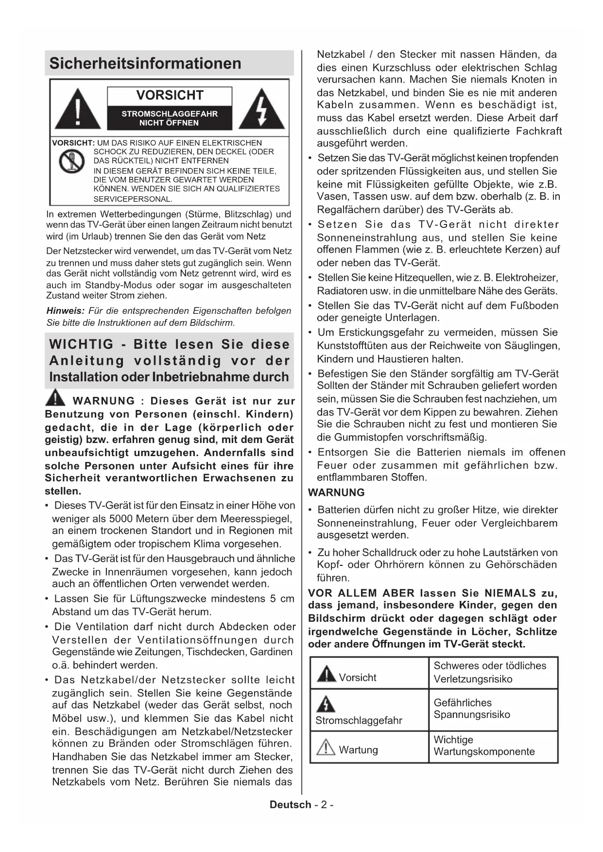 ätzungen mit möglicher Todesfolge. Halten Sie gebrauchte und neue Batterien von Kin- dern fern. Wenn das Batteriefach nicht sicher geschlossen ist, stoppen Sie die Verwendung des Geräts und halten Sie Kinder fern. Falls Sie den Verdacht haben, dass Batterien ver- schluckt wurden oder in irgendeinen Körperteil platziert wurde, suchen Sie sofort medizinische Hilfe auf. – – – – – – – – – – – – Warnung Stabilitätsgefahr Ein TV-Gerät kann umfallen und dabei ernste Ver- letzungen mit möglicher Todesfolge verursachen. Viele Verletzungen, insbesondere bei Kindern, können vermieden werden, wenn die folgenden einfachen