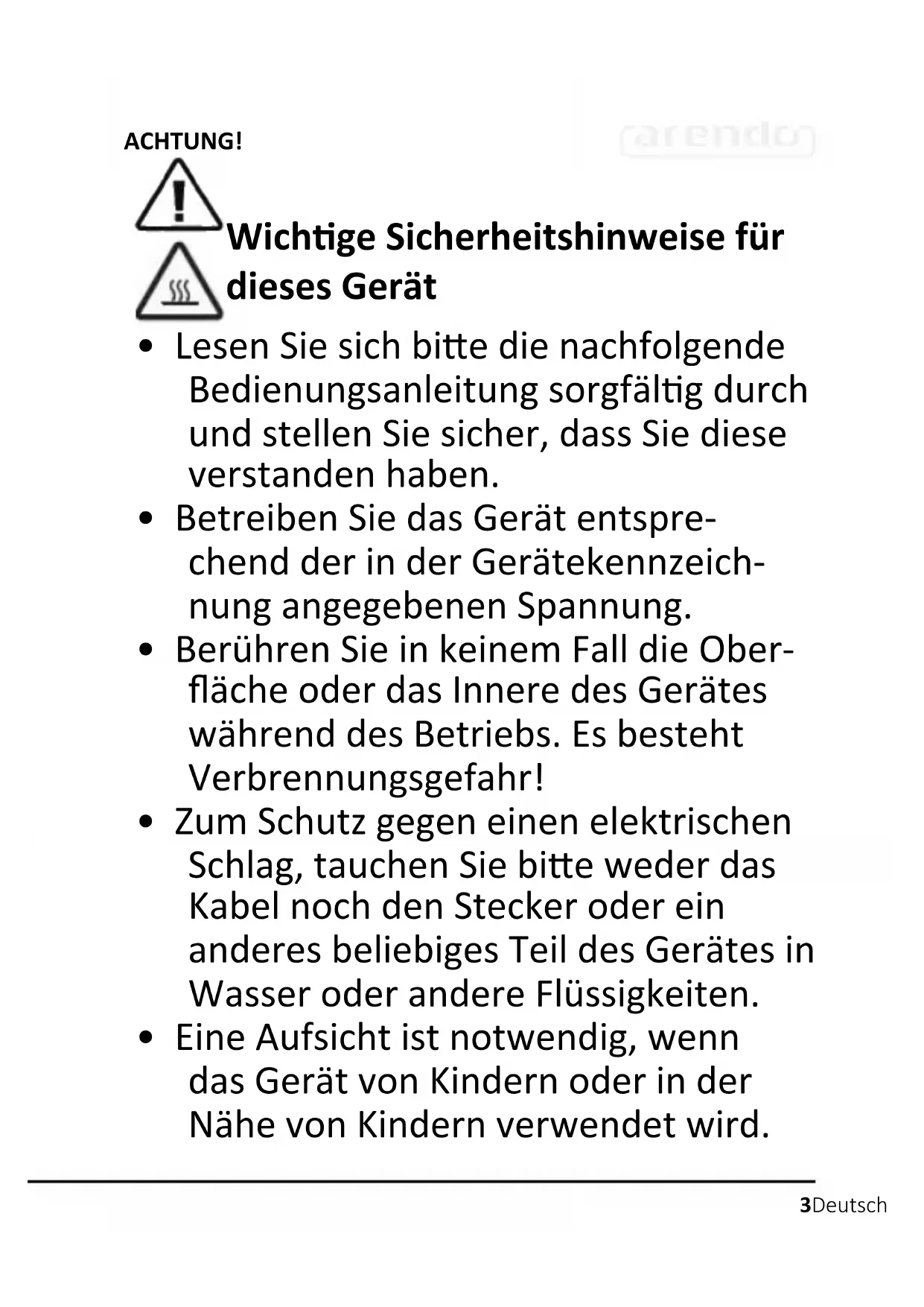 - Schalten Sie das Gerät bei Nichtge- brauch immer aus! Lassen Sie es nie- mals unbeaufsichgt stehen. Achtung! Heiße Oberäche!8 Deutsch Vielen Dank, dass Sie sich für ein Produkt von Arendo entschieden haben. Damit Sie lange Freude mit Ihrem erworbenen Gerät haben, lesen Sie sich bie die nachfolgende Kurzanleitung aufmerksam durch.