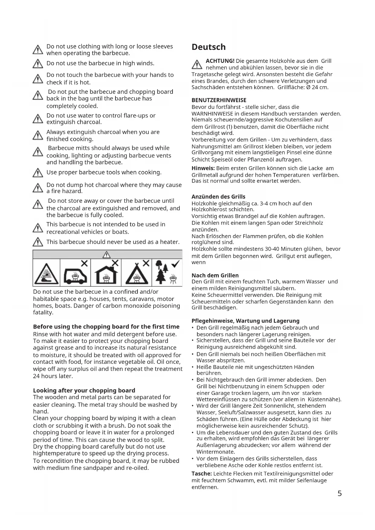 - Vor dem Einlagern des Grills sicherstellen, dass verbliebene Asche oder Kohle restlos entfernt ist. Tasche:Leichte Flecken mit Textilreinigungsmittel oder mit feuchtem Schwamm, evtl. mit milder Seifenlauge entfernen.6 Den Grill nicht mit den Händen berühren um festzustellen, ob er heiß ist. Den Holzkohlegrill und das Schneidebrett erst wieder in die Tasche stecken, wenn der Grill vollständig abgekühlt ist. Niemals Wasser verwenden, um Wiederauammen vorzubeugen oder um Flammen zu löschen. Kohle immer nach Abschluss des Garens löschen. Beim Zubereiten von Speisen, Anzünden, Einstellen der Luftönungen und beim Umgang mit dem Grill immer Grillhandschuhe tragen. Geeignetes Grillbesteck verwenden. Heiße Asche oder noch glühende Kohlen niemals so entsorgen, dass Brandgefahr entstehen kann. Den Grill nicht verstauen oder abdecken, bevor die Kohle gelöscht und entfernt und der Grill vollständig abgekühlt ist. Dieser Grill ist nicht für die Verwendung in oder auf Booten bzw. Wohnwagen resp. Campingbussen vorgesehen. Dieser Grill darf niemals als Heizung verwendet werden. Den Grill nicht in geschlossenen und/oder bewohnbaren Räumen betreiben, z.B.: Gebäuden, Zelten, Wohnwagen, Wohnmobilen, Booten. Es besteht Lebensgefahr durch Kohlenmonoxid- Vergiftung. VordemerstenGebrauch Vor dem Gebrauch mit heißem Wasser und mildem Reinigungsmittel ausspülen. Um das Schneidebrett vor Fettecken zu schützen und seine natürliche Widerstandsfähigkeit gegen Feuchtigkeit zu verstärken, sollte es mit Öl behandelt werden, das für den Kontakt mit Lebensmitteln geeignet ist, z.B. Panzenöl. Einmal einölen, überschüssiges Öl abwischen und die Behandlung nach 24 Stunden wiederholen. Pegehinweis Die Holz- und Metallteile können voneinander getrennt und so leichter gereinigt werden. Das Metalltablett sollte von Hand gespült werden. Das Holzbrett mit einem feuchten Tuch abwischen oder mit einer Bürste reinigen. Das Brett nicht einweichen oder für längere Zeit im Wasser liegen lassen. Dadurch kann das Holz splittern. Das Schneidebrett sorgfältig trocknen lassen, aber keinen hohen Temperaturen aussetzen, um den Vorgang zu beschleunigen (könnte Risse im Holz hervorrufen). Für eine gründliche Aurischung kann das Brett mit Schleifpapier abgeschlien und danach wieder geölt werden. WARNHINWEIS Ein Nichtbeachten der in diesem Handbuch aufgeführten Gefahrenhinweise, Warnungen und Vorsichtsmaßnahmen kann zu schweren oder gar tödlichen Verletzungen oder zu Sachschäden durch Brand oder Explosion führen. Sicherheitssymbole ( ) markieren wichtige Sicherheitsinformationen. Dieses Produkt ist AUSSCHLIESSLICH ZUM GEBRAUCH IM FREIEN bestimmt. NIEMALS in Innenräumen, geschlossenen Bereichen wie Carports, Garagen, Veranden, überdachten Höfen oder sonstigen überdachten Örtlichkeiten benutzen. Nicht zu viel Kohle in den Kohlebehälter füllen und darauf achten, dass die Kohle nicht mit dem Grillkörper in Kontakt kommt. Dieser Grill muss auf einem sicheren, stabilen Untergrund installiert werden, bevor er benutzt wird. Heiße Bauteile nie mit ungeschützten Händen berühren. Nicht in geschlossenen Räumen nutzen. -Bei Benutzung im Haus können sich giftige Dämpfe bilden, die zu schweren oder gar tödlichen Verletzungen führen können. Ausschließlich im Freien an einem gut belüfteten Ort verwenden. Nicht in einer Garage, in einem Gebäude, in Verbindungsgängen zwischen Gebäuden oder an anderweitig umbauten Orten nutzen. Beim Kochen immer den Metallständer verwenden, wie in der Montageanleitung angegeben. VORSICHT! Den Grill niemals unter brennbaren Dächern, Unterständen usw. betreiben. ACHTUNG! Dieses Grillgerät wird sehr heiß und darf während des Betriebes nicht bewegt werden. ACHTUNG! Kinder und Haustiere fernhalten. Jegliche bauliche Veränderung des Grills verursacht Gefahren. Den Grill während der Verwendung nie unbeaufsichtigt lassen. Die Pege- und Wartungsanweisungen immer beachten - den Grill regelmäßig warten. Bei der Aufstellung des Grills einen Mindestabstand von 1 Meter zu brennbaren Gegenständen oder Gebäuden einhalten. Niemals Zündüssigkeit oder in Zündüssigkeit getränkte Briketts auf glühende oder warme Holzkohle geben. Asche nicht entfernen, bevor die Kohlen vollständig verglüht sind und der Grill abgekühlt ist. Keine Kleidung mit langen oder weiten Ärmeln beim Grillen tragen. Den Grill nicht bei starkem Wind benutzen.7 laissé à l’extérieur pour une durée indéterminée, surtout l’hiver. Sac:Avant de ranger votre barbecue, assurez-vous qu'il ne reste aucune cendre ni charbon. ATTENTION Le non-respect des instructions de sécurité contenues dans ce manuel pourrait entraîner des dommages matériels ou corporels graves, voire mortels, un incendie ou une explosion. Les symboles de sécurité ( ) attirent votre attention sur d’importantes informations relatives à la sécurité. Ce produit est destiné à un USAGE EN EXTÉRIEUR UNIQUEMENT. NE JAMAIS l’utiliser dans un espace clos ou semi-clos de tout type (abri pour voitures, garage, véranda, cour intérieure couverte…) ni sous aucun type de couverture ou toiture. Ne pas surcharger le plateau de charbon ou laisser le charbon en contact avec le corps du barbecue. Ce barbecue doit être installé sur une surface sûre et stable avant utilisation. Portez toujours des gants de protection avant toute manipulation des parties chaudes du barbecue. Ne pas utiliser dans des locaux fermés ! En eet, des fumées toxiques pourraient s’accumuler et occasionner des blessures graves voire mortelles. Utilisez uniquement le barbecue à l’extérieur, dans une zone bien ventilée. Ne l’utilisez pas dans un garage, un bâtiment, sous une tonnelle ou dans tout endroit fermé. Toujours utiliser la grille incluse conformément à la notice de montage lors de l'utilisation du barbecue. ATTENTION ! Ce barbecue ne doit pas être utilisé sous une structure en matériau combustible. ATTENTION ! Ce barbecue va deve