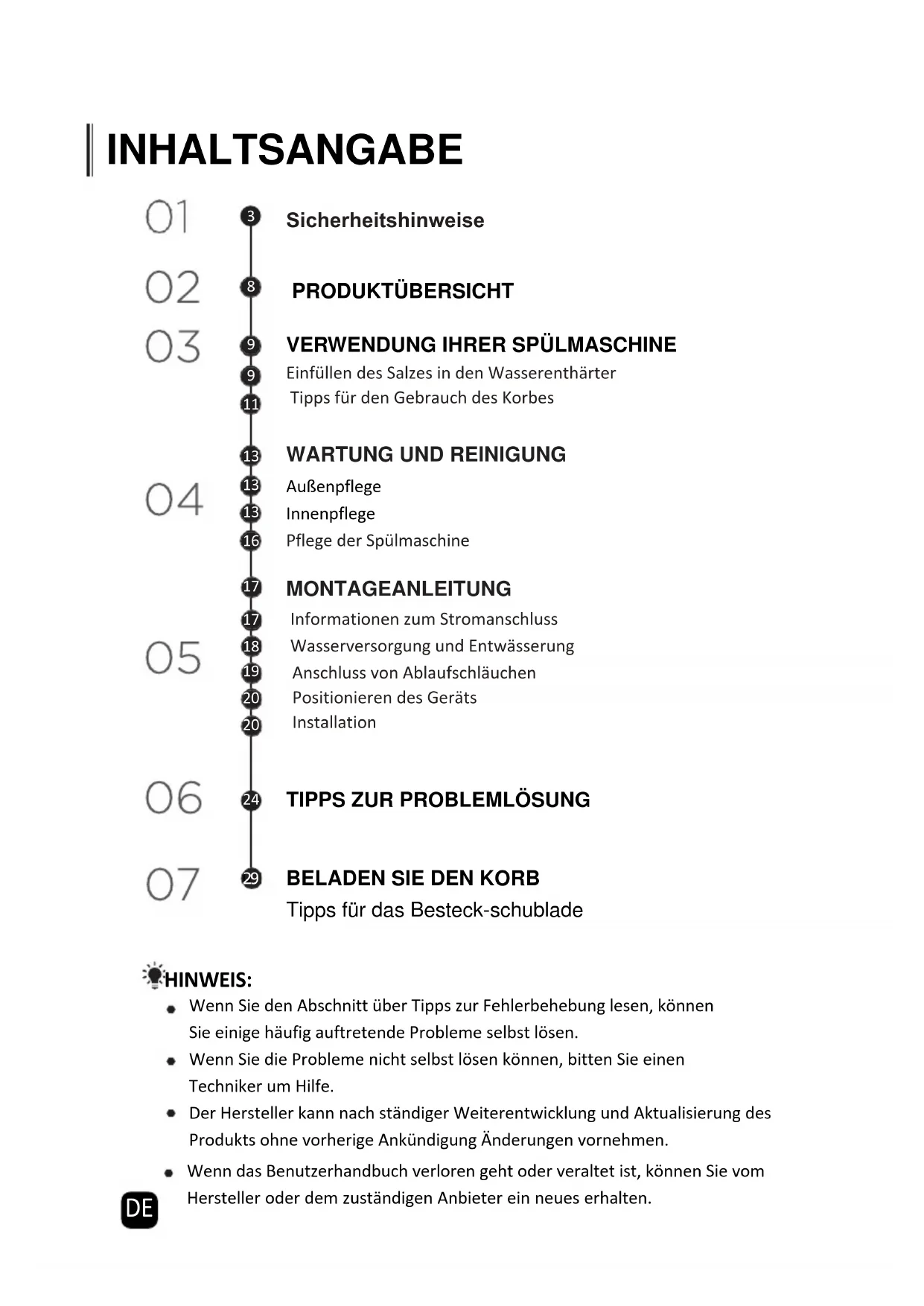 Sicherheitshinweise Einfüllen des Salzes in den WasserenthärterTipps für den Gebrauch des KorbesInformationen zum StromanschlussWasserversorgung und EntwässerungAnschluss von AblaufschläuchenPositionieren des GerätsInstallation