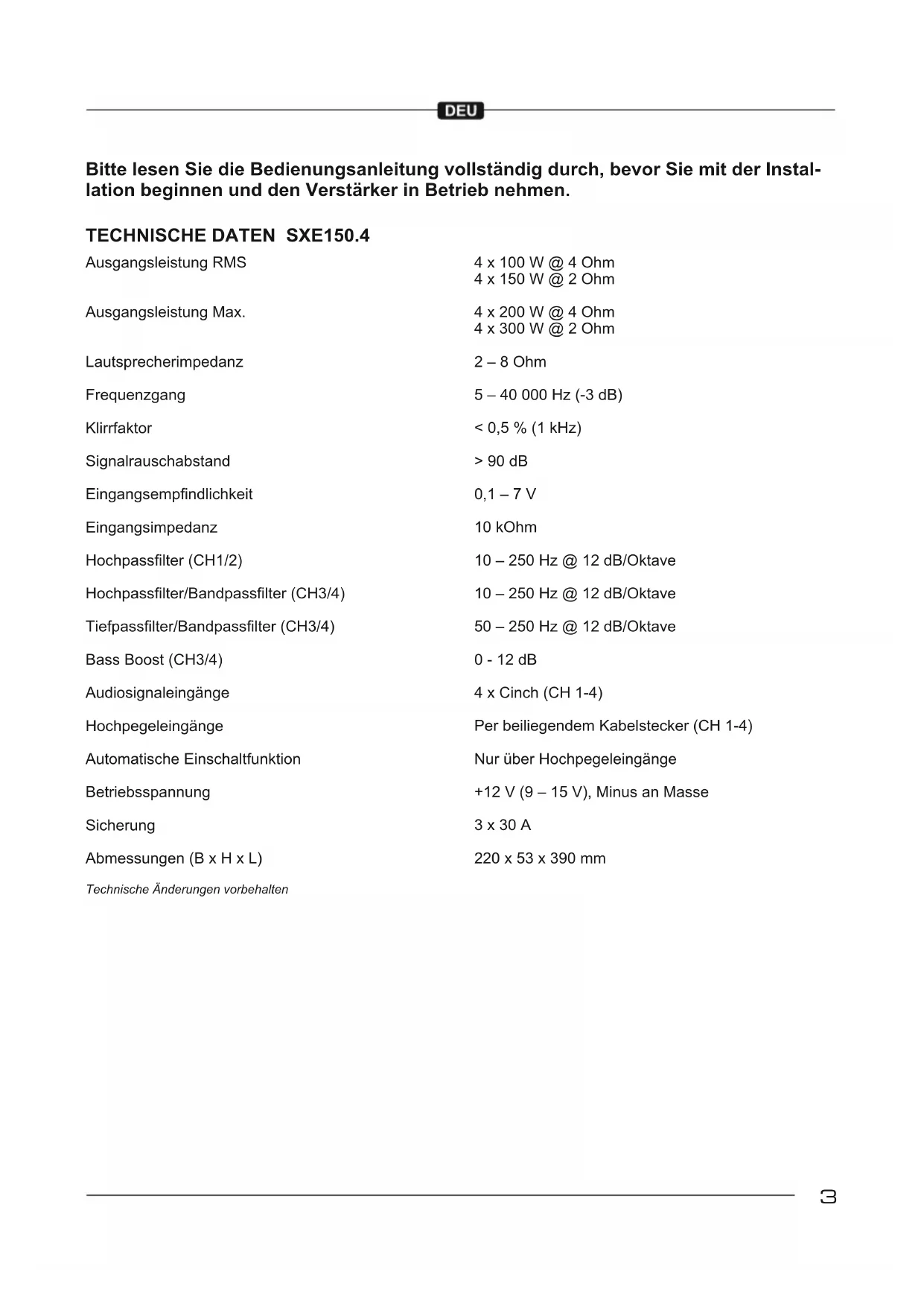 elektrischen Systems am Fahrzeug prüfen, und zwar einschließlich des Verteilers, der Zündkerzen, der Zündkerzenkabel, des Spannungsreglers usw. SCHUTZSCHALTUNG Die POWER/PROTECTION LED (Abb. 1,1) leuchtet grün auf, wenn das Gerät betriebsbereit ist. Die POWER/PROTECTION LED (Abb. 1,1) leuchtet rot auf, wenn das Gerät überhitzt ist, oder ein Kurzschluss bzw. eine zu geringe Impedanz an den Lautsprecheranschlüssen anliegt. Wenn dies eintritt, schaltet die inte- grierte Schutzschaltung den Verstärker automatisch aus. Dieser sollte nach Behebung des Problems wieder funktionieren.8 Please read the user‘s manual carefully before the installation and the rst operation of the amplier. SPECIFICATIONS SXE150.4 Output Power RMS Output Power Max. Loudspeaker impedance (stereo) Frequency Response Total Harmonic Distortion Signal-to-Noise Ratio Input Sensitivity Input Impedance Highpass Filter (CH1/2) Highpass Filter / Bandpass Filter (CH3/4) Lowpass Filter / Bandpass Filter (CH3/4) Bass Boost (CH3/4) Low Level Inputs High Level Inputs Auto Turn On Operating Voltage Fuse Rating Dimensions (B x H x L) 4 x 100 W @ 4 Ohms 4 x 150 W @ 2 Ohms 4 x 200 W @ 4 Ohms 4 x 300 W @ 2 Ohms 2 – 8 Ohms 5 – 40 000 Hz (-3 dB) < 0,5 % (1 kHz) > 90 dB 0,1 – 7 V 10 kOhm 10 – 250 Hz @ 12 dB/Octave 10 – 250 Hz @ 12 dB/Octave 50 – 250 Hz @ 12 dB/Octave