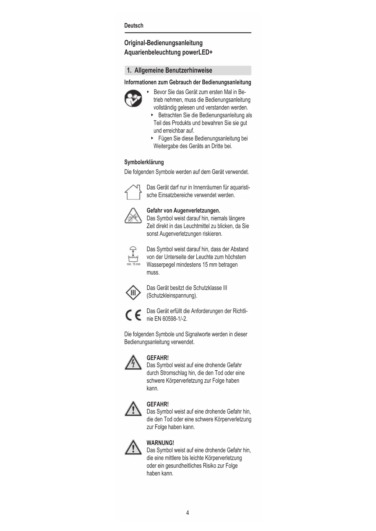Informationen zum Gebrauch der Bedienungsanleitung ▶ Bevor Sie das Gerät zum ersten Mal in Be- trieb nehmen, muss die Bedienungsanleitung vollständig gelesen und verstanden werden. ▶ Betrachten Sie die Bedienungsanleitung als Teil des Produkts und bewahren Sie sie gut und erreichbar auf. ▶ Fügen Sie diese Bedienungsanleitung bei Weitergabe des Geräts an Dritte bei. Symbolerklärung Die folgenden Symbole werden auf dem Gerät verwendet. Das Gerät darf nur in Innenräumen für aquaristi- sche Einsatzbereiche verwendet werden. Gefahr von Augenverletzungen. Das Symbol weist darauf hin, niemals längere Zeit direkt in das Leuchtmittel zu blicken, da Sie sonst Augenverletzungen riskieren. Das Symbol weist darauf hin, dass der Abstand von der Unterseite der Leuchte zum höchstem Wasserpegel mindestens 15 mm betragen muss. Das Gerät besitzt die Schutzklasse III (Schutzkleinspannung). Das Gerät erfüllt die Anforderungen der Richtli- nie EN 60598-1/-2. Die folgenden Symbole und Signalworte werden in dieser Bedienungsanleitung verwendet. GEFAHR! Das Symbol weist auf eine drohende Gefahr durch Stromschlag hin, die den Tod oder eine schwere Körperverletzung zur Folge haben kann. GEFAHR! Das Symbol weist auf eine drohende Gefahr hin, die den Tod oder eine schwere Körperverletzung zur Folge haben kann. WARNUNG! Das Symbol weist auf eine drohende Gefahr hin, die eine mittlere bis leichte Körperverletzung oder ein gesundheitliches Risiko zur Folge haben kann. min. 15 mmDeutsch