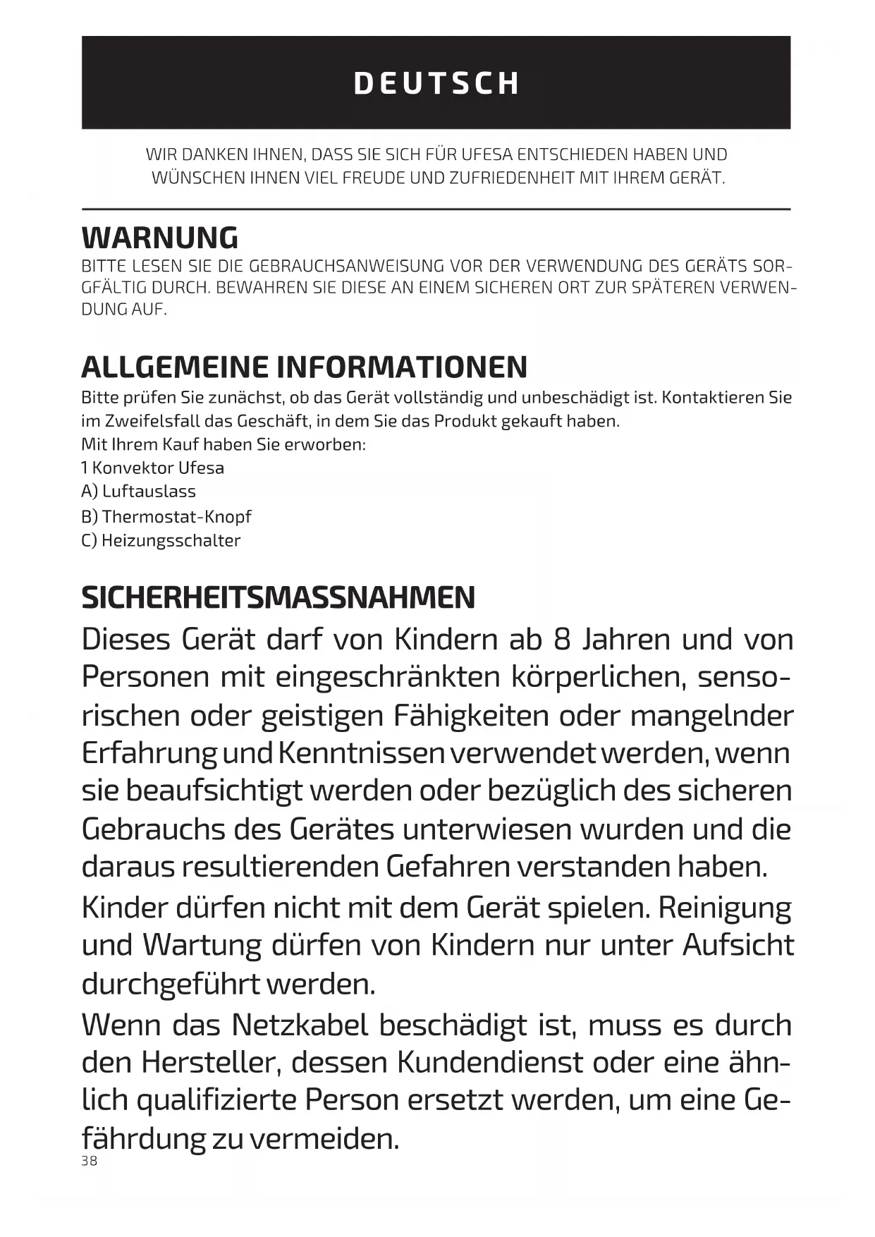 Questo prodotto è conforme alla Direttiva Europea 2012/19/UE sui dispositivi elettrici ed elettronici, nota come WEEE (Waste Electrical and Electronic Equi- pment), che illustra il quadro giuridico applicabile nell’Unione Europea per lo smaltimento e il riutilizzo dei rifiuti di dispositivi elettronici ed elettrici. Non smaltire il prodotto con i rifiuti domestici: rivolgersi al centro di smaltimento di rifiuti elettrici ed elettronici più vicino.38 WIR DANKEN IHNEN, DASS SIE SICH FÜR UFESA ENTSCHIEDEN HABEN UND WÜNSCHEN IHNEN VIEL FREUDE UND ZUFRIEDENHEIT MIT IHREM GERÄT. WARNUNG BITTE LESEN SIE DIE GEBRAUCHSANWEISUNG VOR DER VERWENDUNG DES GERÄTS SOR- GFÄLTIG DURCH. BEWAHREN SIE DIESE AN EINEM SICHEREN ORT ZUR SPÄTEREN VERWEN- DUNG AUF. ALLGEMEINE INFORMATIONEN Bitte prüfen Sie zunächst, ob das Gerät vollständig und unbeschädigt ist. Kontaktieren Sie im Zweifelsfall das Geschäft, in dem Sie das Produkt gekauft haben. Mit Ihrem Kauf haben Sie erworben: 1 Konvektor Ufesa A) Luftauslass B) Thermostat-Knopf C) Heizungsschalter SICHERHEITSMASSNAHMEN Dieses Gerät darf von Kindern ab 8 Jahren und von Personen mit eingeschränkten körperlichen, senso