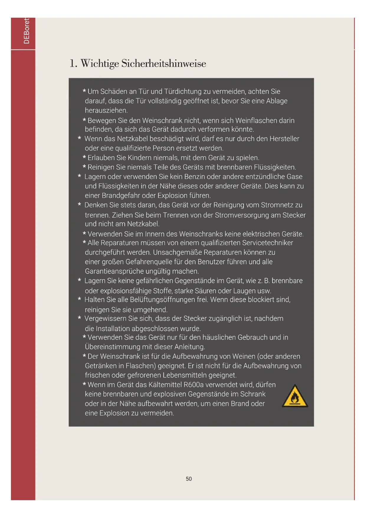 Länge des Netzkabels: 200cm Maximaler Türöffnungswinkel: 100° DEBoretti Weinschränke / Benutzerhandbuch – Installationshinweise57