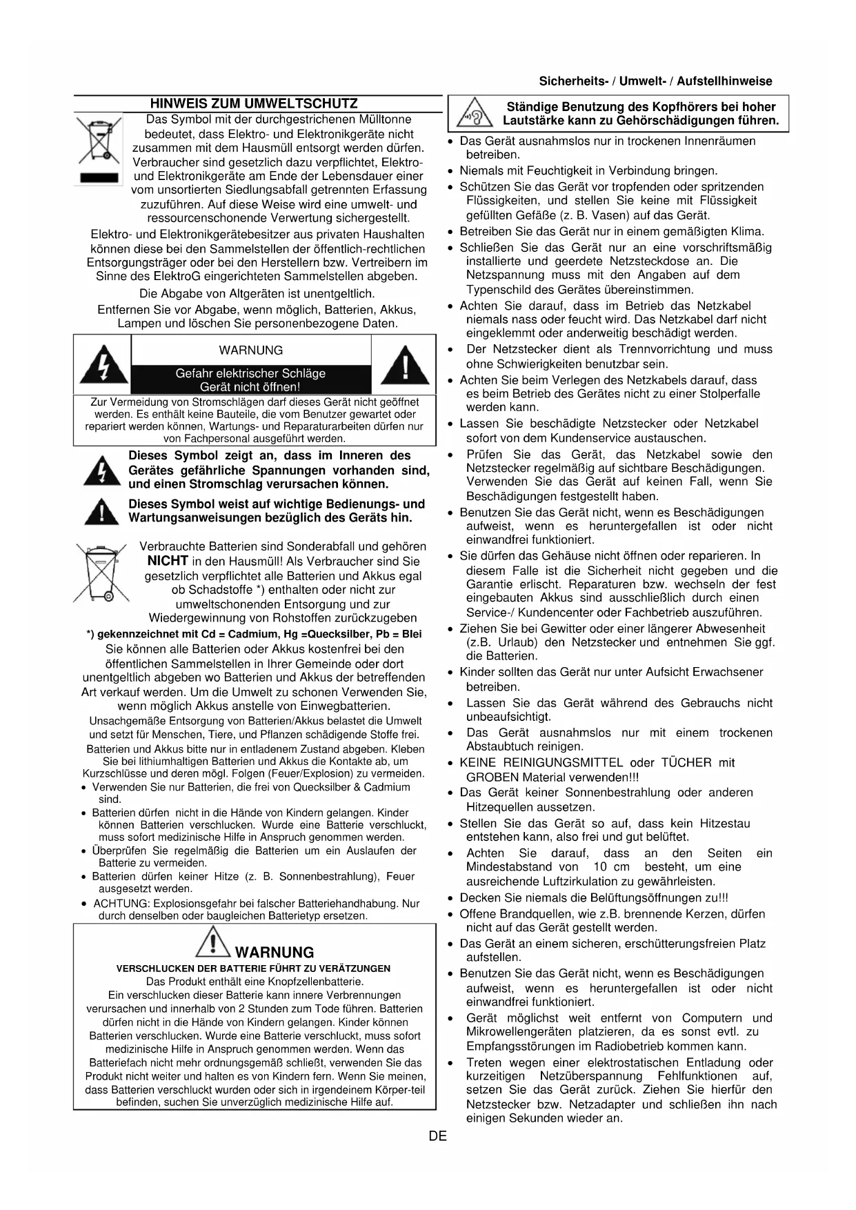 *) gekennzeichnet mit Cd = Cadmium, Hg =Quecksilber, Pb = Blei Sie können alle Batterien oder Akkus kostenfrei bei den öffentlichen Sammelstellen in Ihrer Gemeinde oder dort unentgeltlich abgeben wo Batterien und Akkus der betreffenden Art verkauf werden. Um die Umwelt zu schonen Verwenden Sie, wenn möglich Akkus anstelle von Einwegbatterien. Unsachgemäße Entsorgung von Batterien/Akkus belastet die Umwelt und setzt für Menschen, Tiere, und Pflanzen schädigende Stoffe frei. Batterien und Akkus bitte nur in entladenem Zustand abgeben. Kleben Sie bei lithiumhaltigen Batterien und Akkus die Kontakte ab, um Kurzschlüsse und deren mögl. Folgen (Feuer/Explosion) zu vermeiden.