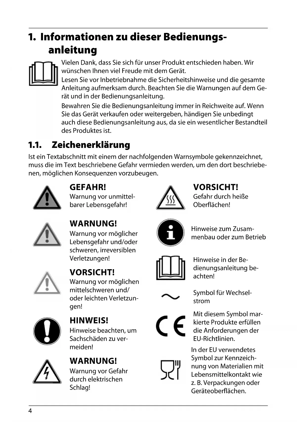 . Informationen zu dieser Bedienungs- anleitung Vielen Dank, dass Sie sich für unser Produkt entschieden haben. Wir wünschen Ihnen viel Freude mit dem Gerät. Lesen Sie vor Inbetriebnahme die Sicherheitshinweise und die gesamte Anleitung aufmerksam durch. Beachten Sie die Warnungen auf dem Ge- rät und in der Bedienungsanleitung. Bewahren Sie die Bedienungsanleitung immer in Reichweite auf. Wenn Sie das Gerät verkaufen oder weitergeben, händigen Sie unbedingt auch diese Bedienungsanleitung aus, da sie ein wesentlicher Bestandteil des Produktes ist. .. Zeichenerklärung Ist ein Textabschnitt mit einem der nachfolgenden Warnsymbole gekennzeichnet, muss die im Text beschriebene Gefahr vermieden werden, um den dort beschriebe- nen, möglichen Konsequenzen vorzubeugen. GEFAHR! Warnung vor unmittel- barer Lebensgefahr! WARNUNG! Warnung vor möglicher Lebensgefahr und/oder schweren, irreversiblen Verletzungen! VORSICHT! Warnung vor möglichen mittelschweren und/ oder leichten Verletzun- gen! HINWEIS! Hinweise beachten, um Sachschäden zu ver- meiden! WARNUNG! Warnung vor Gefahr durch elektrischen Schlag! VORSICHT! Gefahr durch heiße Oberflächen! Hinweise zum Zusam- menbau oder zum Betrieb Hinweise in der Be- dienungsanleitung be- achten! Symbol für Wechsel- strom Mit diesem Symbol mar- kierte Produkte erfüllen die Anforderungen der EU-Richtlinien. In der EU verwendetes Symbol zur Kennzeich- nung von Materialien mit Lebensmittelkontakt wie z.B. Verpackungen oder Geräteoberflächen.5
