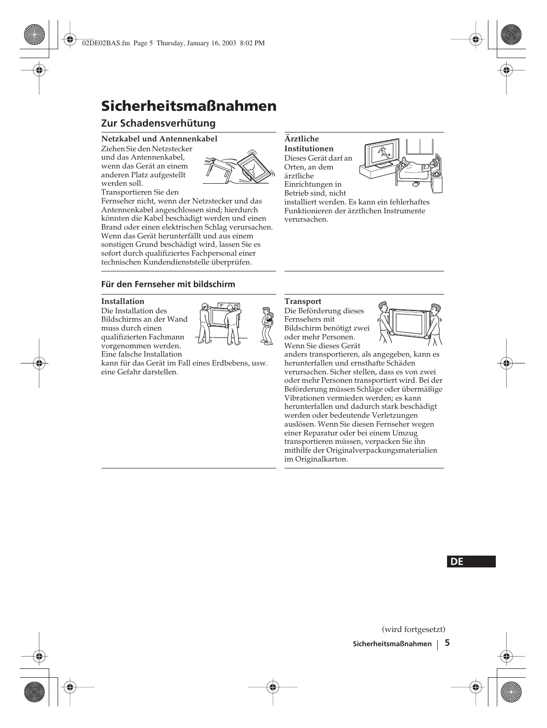 Inhaltsverzeichnis 02DE02BAS.fm Page 5 Thursday, January 16, 2003 8:02 PM Sicherheitsmaßnahmen Zur Schadensverhütung Netzkabel und Antennenkabel Ziehen Sie den Netzstecker und das Antennenkabel, wenn das Gerät an einem anderen Platz aufgestellt werden soll. Transportieren Sie den Fernseher nicht, wenn der Netzstecker und das Antennenkabel angeschlossen sind; hierdurch könnten die Kabel beschädigt werden und einen Brand oder einen elektrischen Schlag verursachen. Wenn das Gerät herunterfällt und aus einem sonstigen Grund beschädigt wird, lassen Sie es sofort durch qualifiziertes Fachpersonal einer technischen Kundendienststelle überprüfen. Ärztliche Institutionen Dieses Gerät darf an Orten, an dem ärztliche Einrichtungen in Betrieb sind, nicht installiert werden. Es kann ein fehlerhaftes Funktionieren der ärztlichen Instrumente verursachen. Für den Fernseher mit bildschirm Installation Transport Die Installation des Bildschirms an der Wand muss durch einen qualifizierten Fachmann vorgenommen werden. Eine falsche Installation kann für das Gerät im Fall eines Erdbebens, usw. eine Gefahr darstellen. Die Beförderung dieses Fernsehers mit Bildschirm benötigt zwei oder mehr Personen. Wenn Sie dieses Gerät anders transportieren, als angegeben, kann es herunterfallen und ernsthafte Schäden verursachen. Sicher stellen, dass es von zwei oder mehr Personen transportiert wird. Bei der Beförderung müssen Schläge oder übermäßige Vibrationen vermieden werden; es kann herunterfallen und dadurch stark beschädigt werden oder bedeutende Verletzungen auslösen. Wenn Sie diesen Fernseher wegen einer Reparatur oder bei einem Umzug transportieren müssen, verpacken Sie ihn mithilfe der Originalverpackungsmaterialien im Originalkarton.