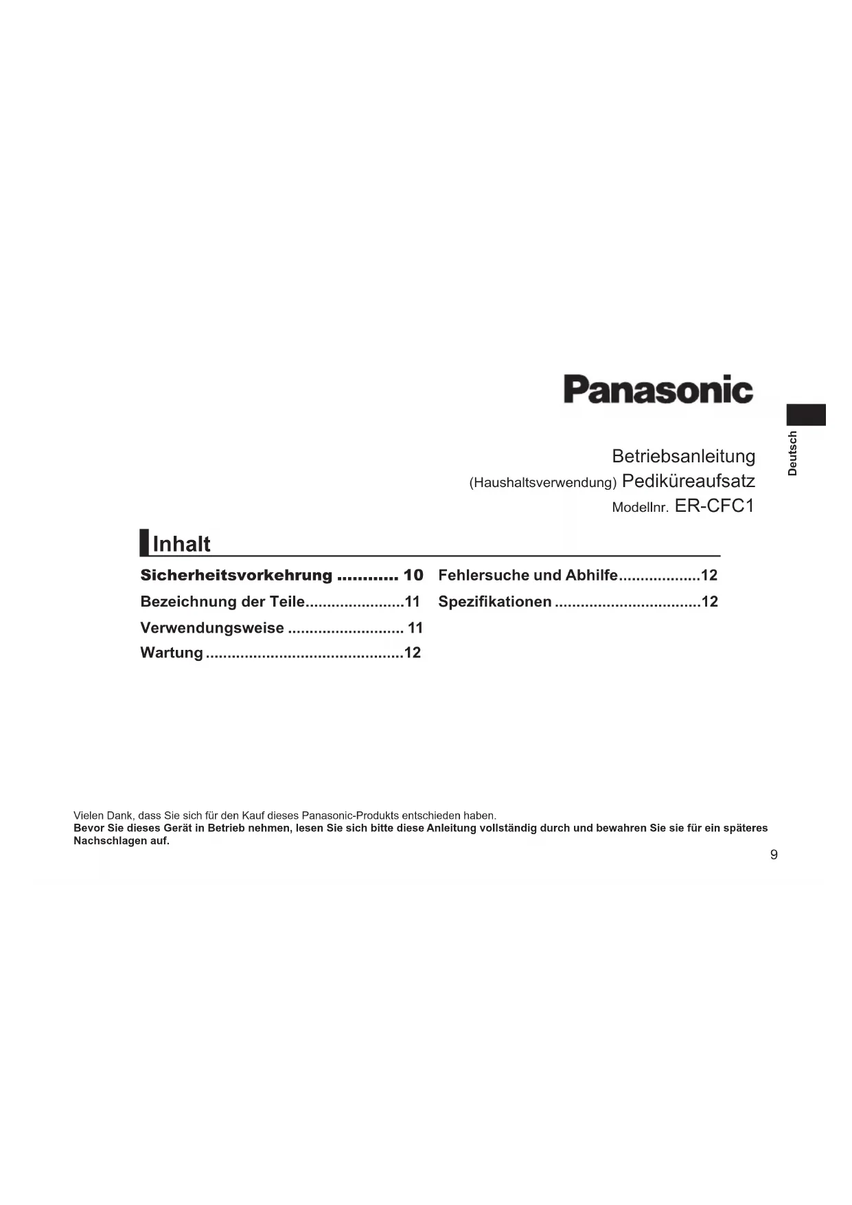 - Lifetime is approximately 1 year (assuming a single use every 2 weeks with approximately 10 minutes per use). Troubleshooting Problem ActionThe appliance does not operate.Reattach the frame.The appliance stops during operation.Contact to skin with gentle force.CannotleTheleiswornout.Contactanauthorize service centre and buy it.Cannot get rid of odor.Soaktheleinwaterforapproximately 24 hours before washing.If the problems still cannot be solved, contact your dealer or a service centre authorized by Panasonic for repair. Specications Airborne Acoustical Noise 65 (dB (A) re 1 pW) This product is intended for household use only.9 Deutsch Betriebsanleitung (Haushaltsverwendung) Pediküreaufsatz Modellnr. ER‑CFC1 Vielen Dank, dass Sie sich für den Kauf dieses Panasonic‑Produkts entschieden haben. Bevor Sie dieses Gerät in Betrieb nehmen, lesen Sie sich bitte diese Anleitung vollständig durch und bewahren Sie sie für ein späteres Nachschlagen auf. Sicherheitsvorkehrung 10 Bezeichnung der Teile .......................11 Verwendungsweise ........................... 11 Wartung ..............................................12 Fehlersuche und Abhilfe ...................12 Spezikationen ..................................12 Inhalt10 Deutsch WARNUNG