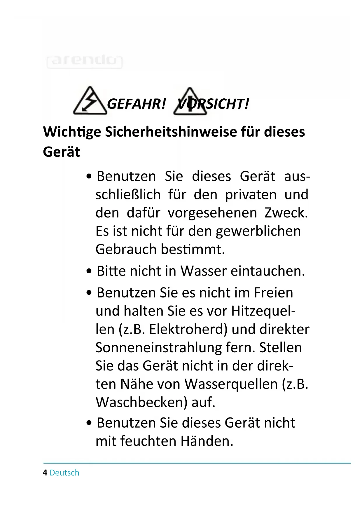 - Halten Sie Kinder von dem Gerät fern. Stellen Sie sicher, dass Sie nicht in der Nähe des Gerätes spielen.10 Deutsch Vielen Dank, dass Sie sich für ein Produkt von Arendo entschieden haben. Damit Sie lange Freude mit Ihrem erworbenen Gerät haben, lesen Sie sich bie die nach- folgende Kurzanleitung aufmerksam durch. Prüfen Sie vor Inbetriebnahme der ge- lieferten Ware, ob diese vollständig, fehlerfrei und unbeschädigt ist.
