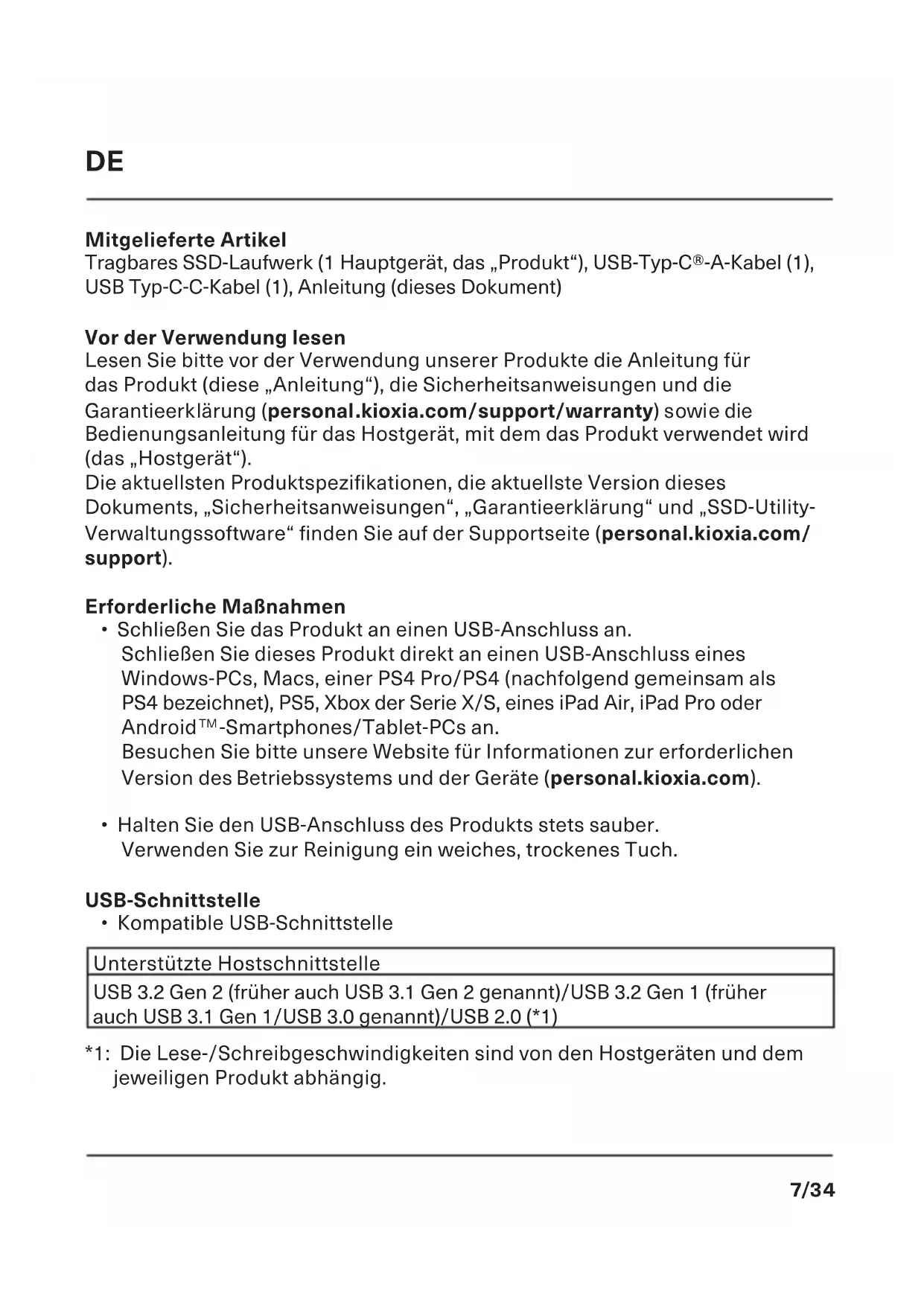 Finden Sie kostenlos die Bedienungsanleitung des Geräts EXCERIA PLUS Portable SSD Kioxia als PDF.