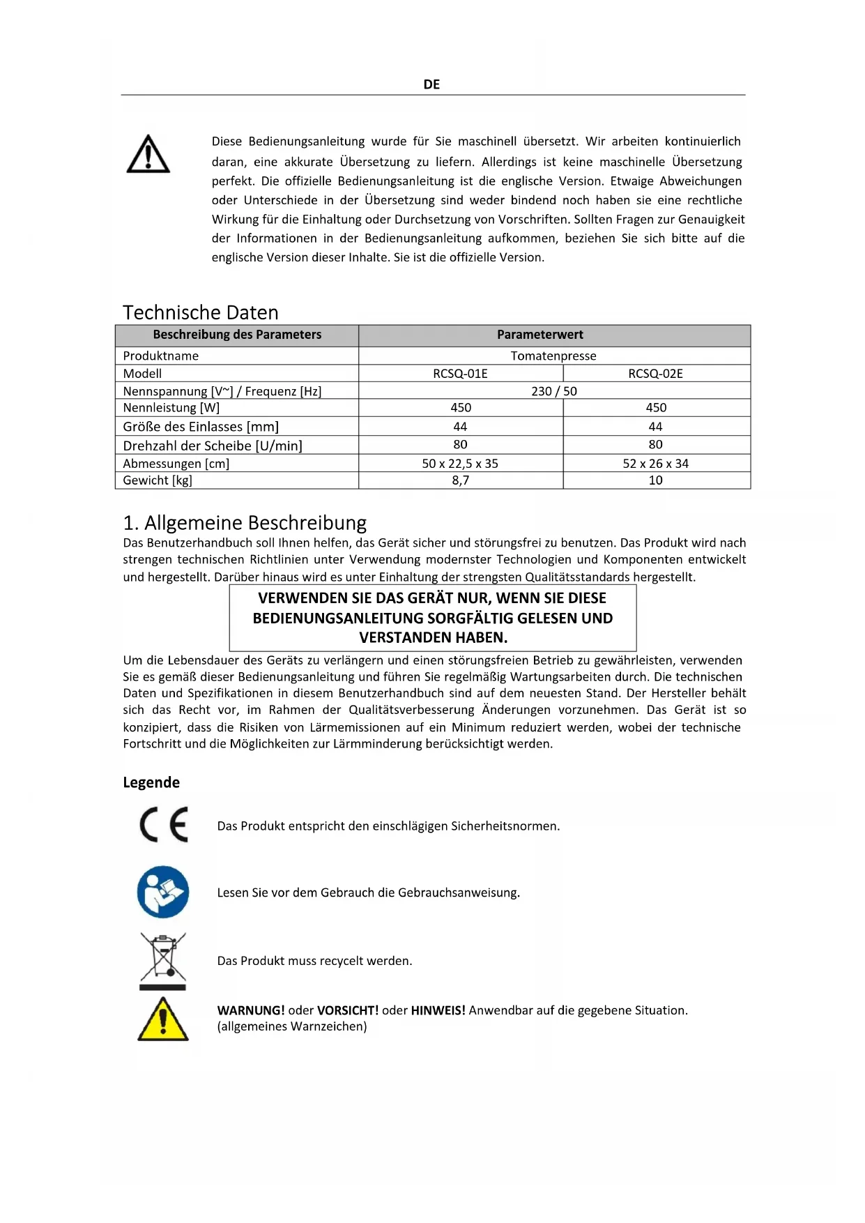Adresa výrobcuDE Diese Bedienungsanleitung wurde für Sie maschinell übersetzt. Wir arbeiten kontinuierlich daran, eine akkurate Übersetzung zu liefern. Allerdings ist keine maschinelle Übersetzung perfekt. Die offizielle Bedienungsanleitung ist die englische Version. Etwaige Abweichungen oder Unterschiede in der Übersetzung sind weder bindend noch haben sie eine rechtliche Wirkung für die Einhaltung oder Durchsetzung von Vorschriften. Sollten Fragen zur Genauigkeit der Informationen in der Bedienungsanleitung aufkommen, beziehen Sie sich bitte auf die englische Version dieser Inhalte. Sie ist die offizielle Version. Technische Daten Beschreibung des Parameters Parameterwert Produktname Tomatenpresse Modell RCSQ-01E RCSQ-02E Nennspannung [V~] / Frequenz [Hz] 230 / 50 Nennleistung [W]