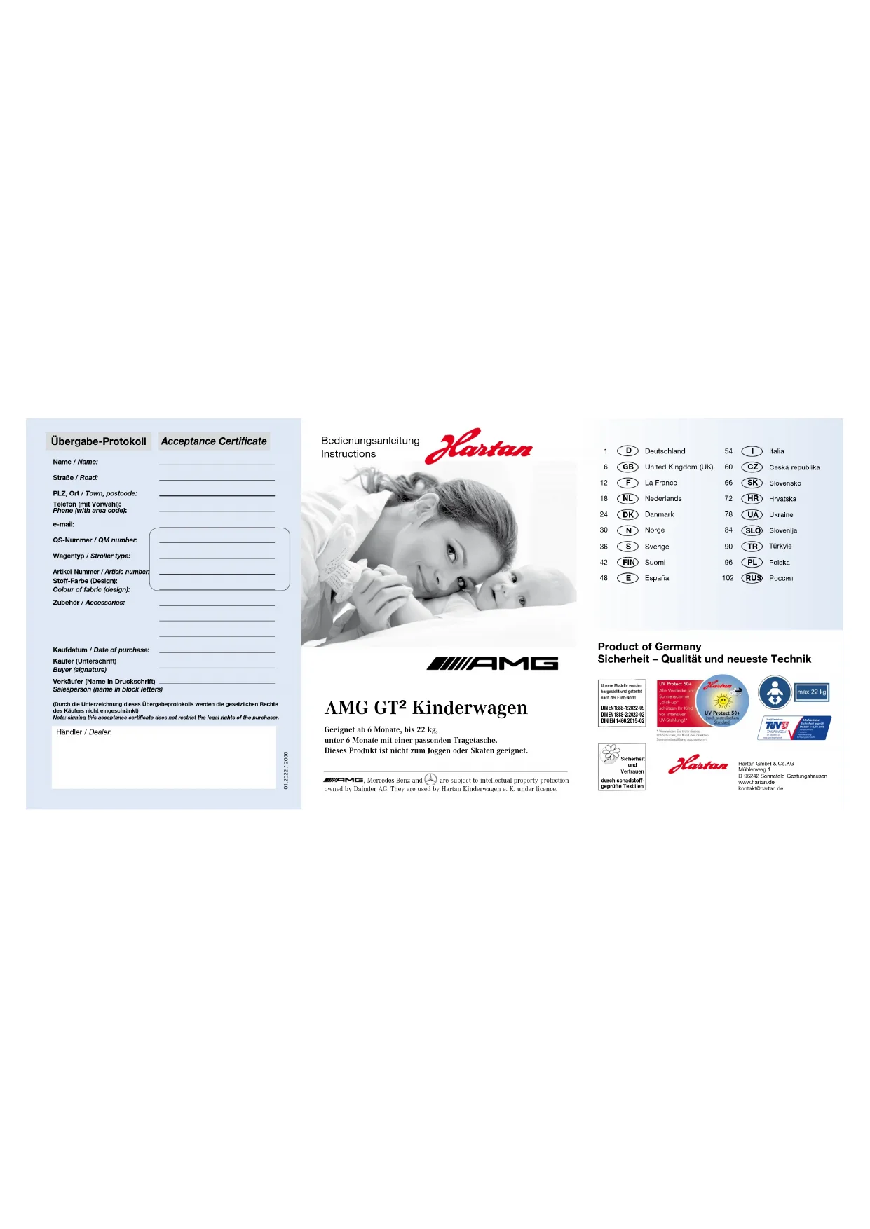 RUS AMG GT² Kinderwagen Geeignet ab 6 Monate, bis 22 kg, unter 6 Monate mit einer passenden Tragetasche. Dieses Produkt ist nicht zum Joggen oder Skaten geeignet. , Mercedes-Benz and are subject to intellectual property protection owned by Daimler AG. They are used by Hartan Kinderwagen e. K. under licence. , Mercedes-Benz and are subject to intellectual property protection Product of Germany Sicherheit – Qualität und neueste Technik Sicherheit und Vertrauen durch schadstoff- geprüfte Textilien Hartan GmbH & Co.KG Mühlenweg 1 D-96242 Sonnefeld-Gestungshausen www.hartan.de kontakt@hartan.de