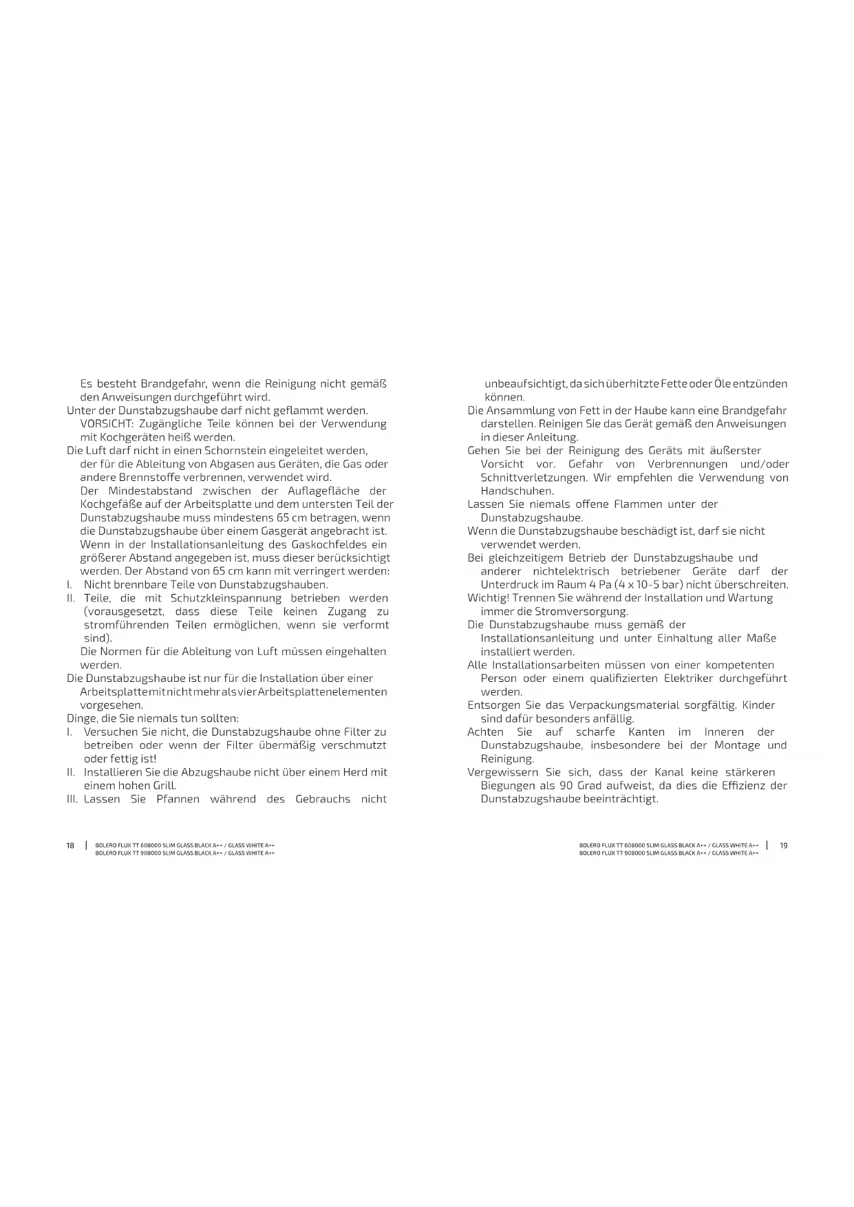 drehen Sie sie, bis sie fest sitzen. Booster-Funktion Symbol - Drücken Sie im Standby-Modus auf das Booster-Funktion Symbol, die Dunstabzugshaube gibt ein akustisches Signal ab. - Auf dem Display erscheint die Zahl 4, die anzeigt, dass der maximale Beatmungsmodus (Booster) aktiviert wurde. Nach 5 Minuten kehrt das Gerät automatisch auf Stufe 3 zurück. Symbole „erhöhen/verringern“ - Wenn sich die Dunstabzugshaube im Standby-Modus bendet, drücken Sie das Booster- Symbol und ein akustisches Signal ertönt. Auf dem Display erscheint die Zahl 1, die anzeigt, dass die Haube mit niedriger Geschwindigkeit arbeitet. Wenn Sie das Symbol erneut drücken, erscheint auf dem Display die Zahl 2, die anzeigt, dass die Haube mit mittlerer Geschwindigkeit arbeitet. Wenn Sie das Symbol ein drittes Mal drücken, erscheint die Zahl 3 auf dem Display und die Haube arbeitet mit der höchsten Geschwindigkeit. - Um die Absaugleistung auf die mittlere Stufe zu reduzieren, drücken Sie auf das Symbol zum Verringern, woraufhin die Zahl 2 auf dem Display erscheint. - Wenn Sie das Symbol erneut drücken, erscheint auf dem Display die Zahl 1, was bedeutet, dass die Haube mit der niedrigsten Geschwindigkeit arbeitet. Delay-Funktion Symbol (verzögerte Abschaltung) - Wenn die Dunstabzugshaube in Betrieb ist, drücken Sie das Berührungssymbol „Delay“, es ertönt ein akustisches Signal und das Symbol blinkt, was anzeigt, dass die Dunstabzugshaube in den Modus der verzögerten Abschaltung übergegangen ist. Die Verzögerungszeit beträgt 5 Minuten. - Nach 5 Minuten schaltet sich die Dunstabzugshaube aus. Licht ein/aus-Symbol Drücken Sie das Licht ein/aus-Symbol, um das Licht der Dunstabzugshaube einzuschalten. Drücken Sie das Symbol erneut, um es auszuschalten. Gestensteuerung - Damit diese Funktion optimal funktioniert, sollte die Hand in der Nähe der Dunstabzugshaube platziert werden, in einem Abstand von höchstens 80 mm. - Schieben Sie den Zeiger von links nach rechts, um die Glocke mit niedriger Geschwindigkeit zu betätigen. Es ertönt ein akustisches Signal und das Lichtsymbol leuchtet auf. Schieben Sie Ihre Hand erneut, um die Absaugleistung zu erhöhen, und so weiter bis zur Booster- Geschwindigkeit des „Booster“-Modus. - Umgekehrt wird die Dunstabzugshaube durch Bewegen der Hand von rechts nach links von der Booster-Modus auf die Stufe 3 heruntergeschaltet, und so weiter, bis sie sich ausschaltet. Das Licht bleibt an, wischen Sie also erneut nach links, um es auszuschalten.BOLERO FLUX TT 608000 SLIM GLASS BLACK A++ / GLASS WHITE A++ BOLERO FLUX TT 908000 SLIM GLASS BLACK A++ / GLASS WHITE A++ BOLERO FLUX TT 608000 SLIM GLASS BLACK A++ / GLASS WHITE A++ BOLERO FLUX TT 908000 SLIM GLASS BLACK A++ / GLASS WHITE A++