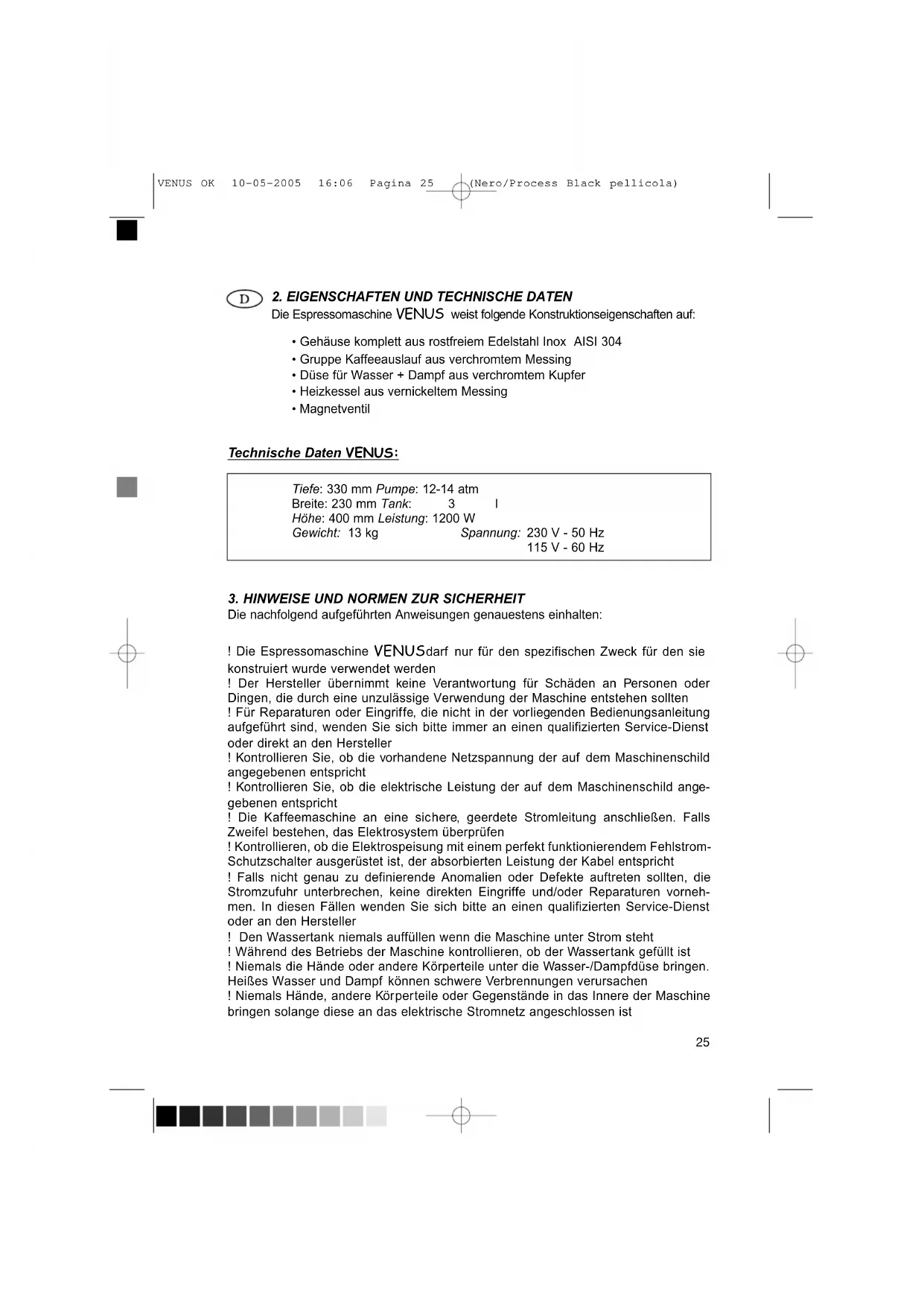Die nachfolgend aufgeführten Anweisungen genauestens einhalten: ! Die Espressomaschine VENUS darf nur für den spezifischen Zweck für den sie konstruiert wurde verwendet werden ! Der Hersteller übernimmt keine Verantwortung für Schäden an Personen oder Dingen, die durch eine unzulässige Verwendung der Maschine entstehen sollten ! Für Reparaturen oder Eingriffe, die nicht in der vorliegenden Bedienungsanleitung aufgeführt sind, wenden Sie sich bitte immer an einen qualifizierten Service-Dienst oder direkt an den Hersteller ! Kontrollieren Sie, ob die vorhandene Netzspannung der auf dem Maschinenschild angegebenen entspricht ! Kontrollieren Sie, ob die elektrische Leistung der auf dem Maschinenschild ange- gebenen entspricht ! Die Kaffeemaschine an eine sichere, geerdete Stromleitung anschließen. Falls Zweifel bestehen, das Elektrosystem überprüfen ! Kontrollieren, ob die Elektrospeisung mit einem perfekt funktionierendem Fehlstrom- Schutzschalter ausgerüstet ist, der absorbierten Leistung der Kabel entspricht ! Falls nicht genau zu definierende Anomalien oder Defekte auftreten sollten, die Stromzufuhr unterbrechen, keine direkten Eingriffe und/oder Reparaturen vorneh- men. In diesen Fällen wenden Sie sich bitte an einen qualifizierten Service-Dienst oder an den Hersteller ! Den Wassertank niemals auffüllen wenn die Maschine unter Strom steht ! Während des Betriebs der Maschine kontrollieren, ob der Wassertank gefüllt ist ! Niemals die Hände oder andere Körperteile unter die Wasser-/Dampfdüse bringen. Heißes Wasser und Dampf können schwere Verbrennungen verursachen ! Niemals Hände, andere Körperteile oder Gegenstände in das Innere der Maschine bringen solange diese an das elektrische Stromnetz angeschlossen ist VENUS OK 10-05-2005 16:06 Pagina 25 (Nero/Process Black pellicola)26 ! Die Maschine nicht mit nassen Händen oder Füßen berühren ! Die heißen Teile der Maschine (untere Komponenten der Gruppe Kaffeeauslauf und Wasser/Dampfdüse) nicht berühren ! Vor Beginn der Wartungsarbeiten an der Maschine darauf achten, dass die Stromzufuhr unterbrochen ist (den Stecker herausziehen, nicht am Kabel ziehen) oder den Hauptschalter abstellen ! Sollte das Speisekabel beschädigt werden, muss es durch ein neues, beim Hersteller und/oder beim Service-Zentrum erhältliches, ersetzt werden ! Die Espressomaschine niemals in Flüssigkeiten jedweder Art tauchen ! Zur Reinigung der Maschine keine Scheuermittel oder ähnliche Substanzen verwen- den ! Die Maschine keinen Witterungseinflüssen aussetzen ! Kindern oder Personen, die nicht mit der Bedienung der Maschine vertraut sind, den Zugang zur Maschine verbieten ! Die Espressomaschine keinen Hitzequellen aussetzen