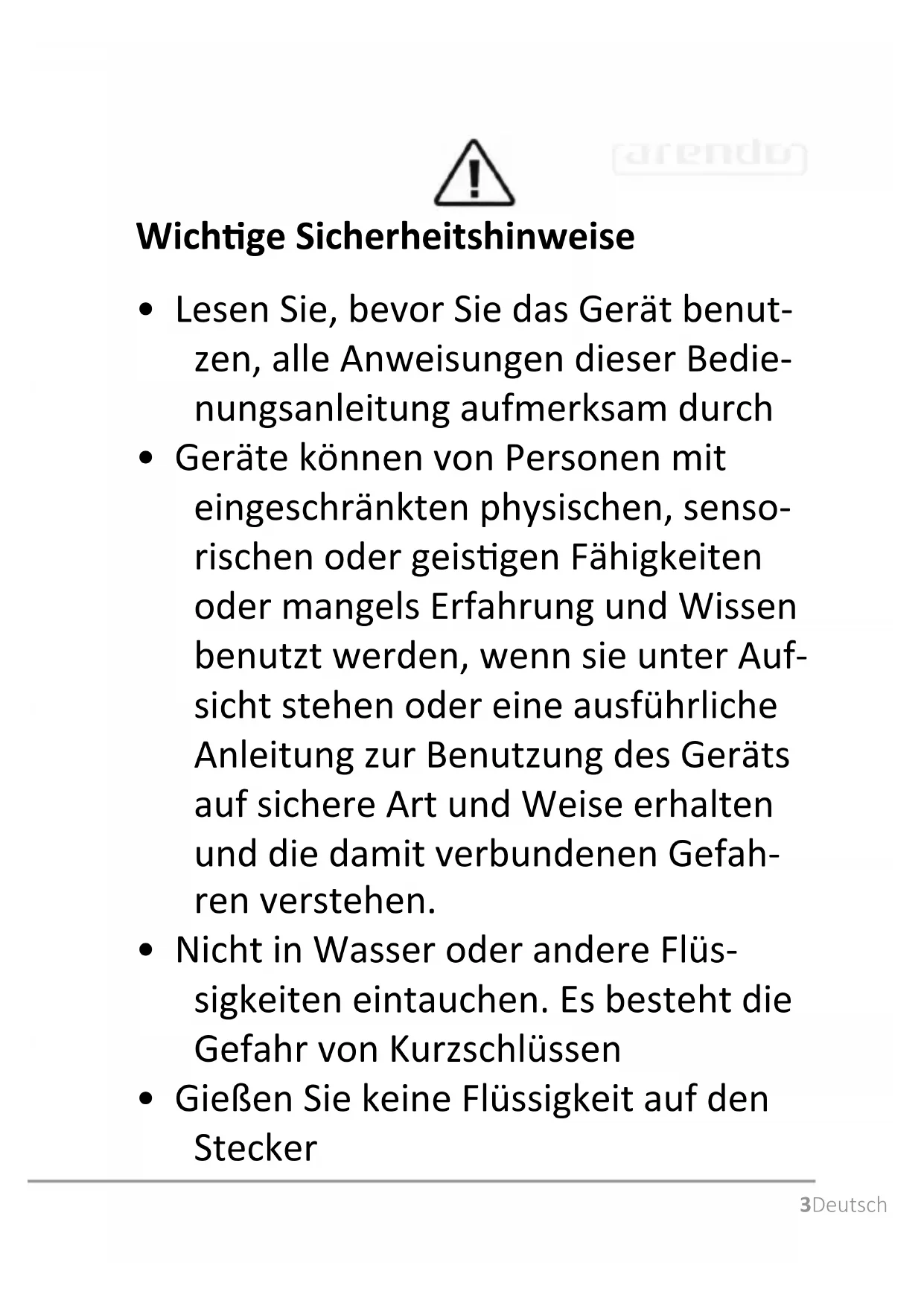 - Heben Sie diese Anweisungen bie sorgfälg auf!12 Deutsch Vielen Dank, dass Sie sich für ein Produkt von Arendo entschieden haben. Damit Sie auch lange Freude mit Ihrem erworbenen Gerät haben werden, lesen Sie sich bie die nachfolgende Bedienungsanleitung aufmerksam durch.