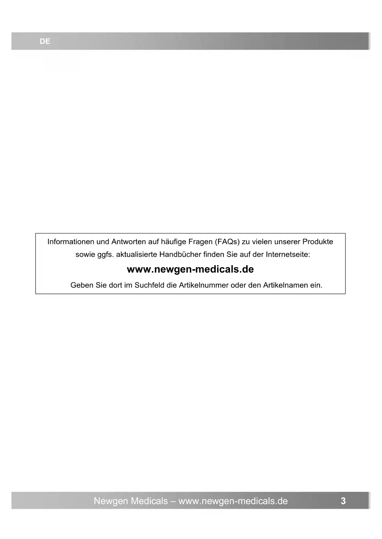 - Benutzen Sie die Zuleitung nicht zum Tragen und schützen Sie diese vor Hitze (Herdplatte / offene Flamme).DE 6 Newgen Medicals – www.newgen-medicals.de Sicherheitshinweise