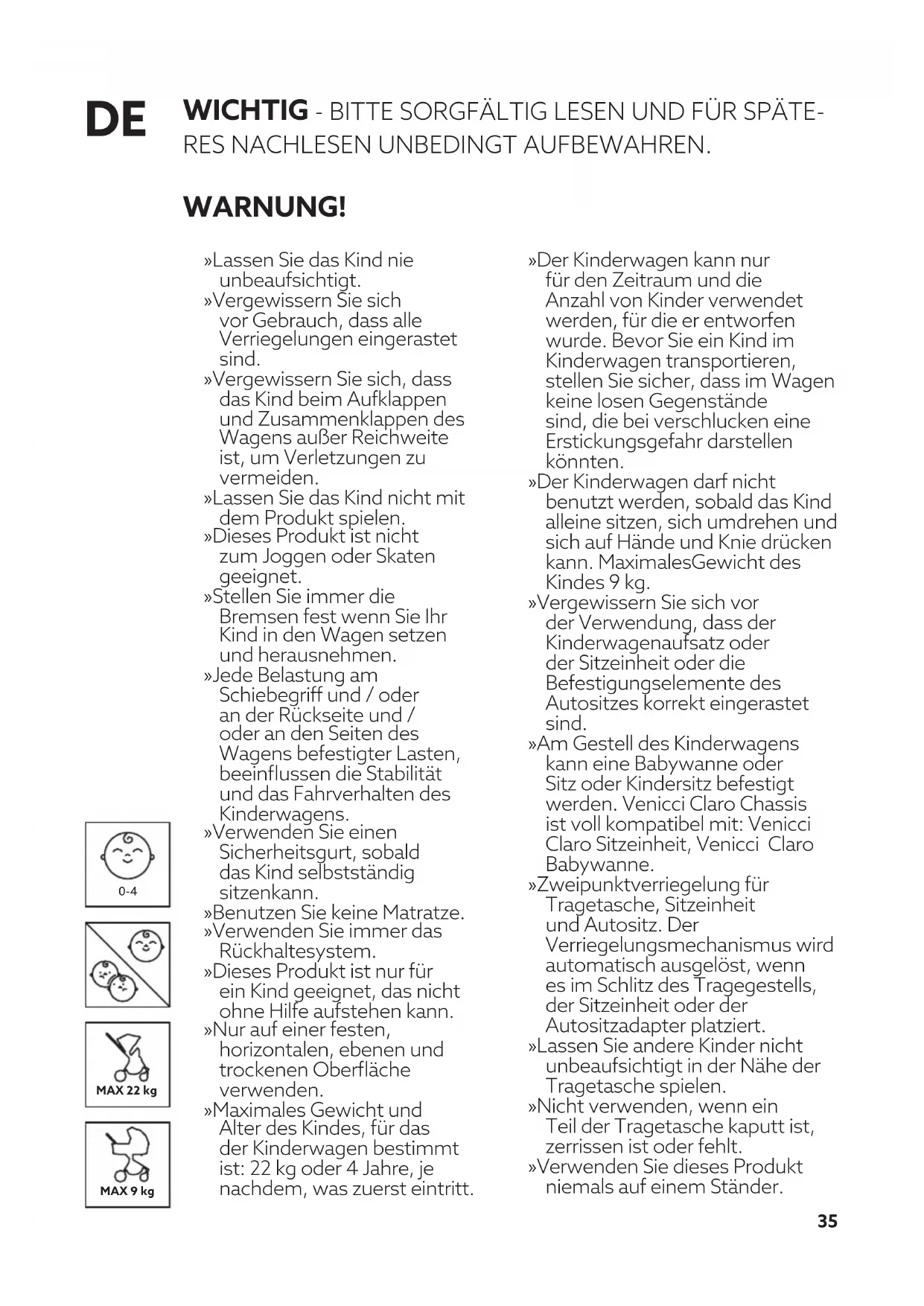 WICHTIG - BITTE SORGFÄLTIG LESEN UND FÜR SPÄTE- RES NACHLESEN UNBEDINGT AUFBEWAHREN. WARNUNG! » Lassen Sie das Kind nie unbeaufsichtigt. » Vergewissern Sie sich vor Gebrauch, dass alle Verriegelungen eingerastet sind. » Vergewissern Sie sich, dass das Kind beim Aufklappen und Zusammenklappen des Wagens außer Reichweite ist, um Verletzungen zu vermeiden. » Lassen Sie das Kind nicht mit dem Produkt spielen. » Dieses Produkt ist nicht zum Joggen oder Skaten geeignet. » Stellen Sie immer die Bremsen fest wenn Sie Ihr Kind in den Wagen setzen und herausnehmen. » Jede Belastung am Schiebegriff und / oder an der Rückseite und / oder an den Seiten des Wagens befestigter Lasten, beeinflussen die Stabilität und das Fahrverhalten des Kinderwagens. » Verwenden Sie einen Sicherheitsgurt, sobald das Kind selbstständig sitzenkann. » Benutzen Sie keine Matratze. » Verwenden Sie immer das Rückhaltesystem. » Dieses Produkt ist nur für ein Kind geeignet, das nicht ohne Hilfe aufstehen kann. » Nur auf einer festen, horizontalen, ebenen und trockenen Oberfläche verwenden. » Maximales Gewicht und Alter des Kindes, für das der Kinderwagen bestimmt ist: 22 kg oder 4 Jahre, je nachdem, was zuerst eintritt. » Der Kinderwagen kann nur für den Zeitraum und die Anzahl von Kinder verwendet werden, für die er entworfen wurde. Bevor Sie ein Kind im Kinderwagen transportieren, stellen Sie sicher, dass im Wagen keine losen Gegenstände sind, die bei verschlucken eine Erstickungsgefahr darstellen könnten. » Der Kinderwagen darf nicht benutzt werden, sobald das Kind alleine sitzen, sich umdrehen und sich auf Hände und Knie drücken kann. MaximalesGewicht des Kindes 9 kg. » Vergewissern Sie sich vor der Verwendung, dass der Kinderwagenaufsatz oder der Sitzeinheit oder die Befestigungselemente des Autositzes korrekt eingerastet sind. » Am Gestell des Kinderwagens kann eine Babywanne oder Sitz oder Kindersitz befestigt werden. Venicci Claro Chassis ist voll kompatibel mit: Venicci Claro Sitzeinheit, Venicci Claro Babywanne. » Zweipunktverriegelung für Tragetasche, Sitzeinheit und Autositz. Der Verriegelungsmechanismus wird automatisch ausgelöst, wenn es im Schlitz des Tragegestells, der Sitzeinheit oder der Autositzadapter platziert. » Lassen Sie andere Kinder nicht unbeaufsichtigt in der Nähe der Tragetasche spielen. » Nicht verwenden, wenn ein Teil der Tragetasche kaputt ist, zerrissen ist oder fehlt. » Verwenden Sie dieses Produkt niemals auf einem Ständer.36