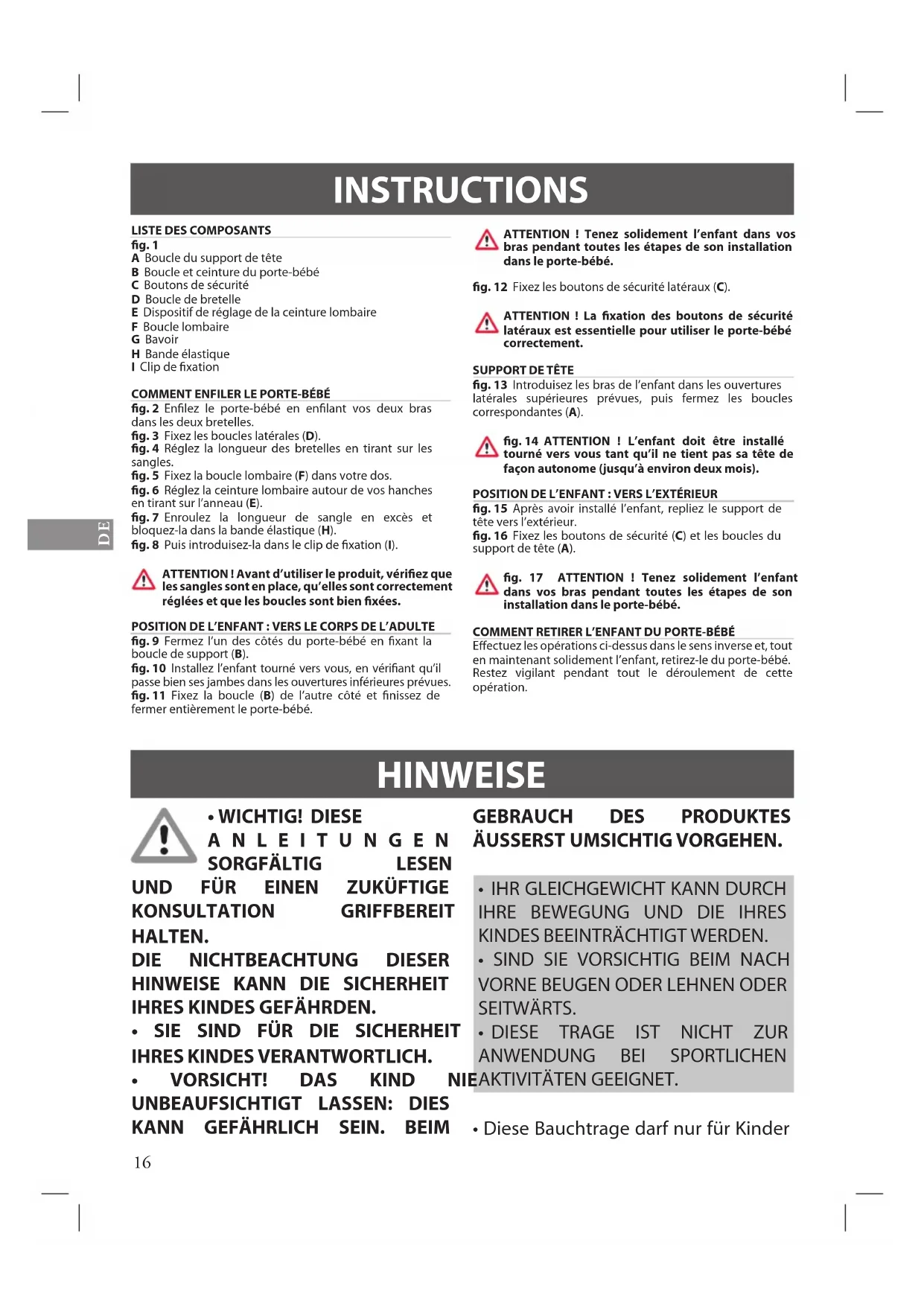 - STURZGEFAHR - Kleine Babys können durch die Beinönung aus der Bauchtrage fallen. Immer sicherstellen, dass alle Schnallen, Knöpfe, Riemen und Längeneinstellungen vor dem Gebrauch korrekt befestigt sind.