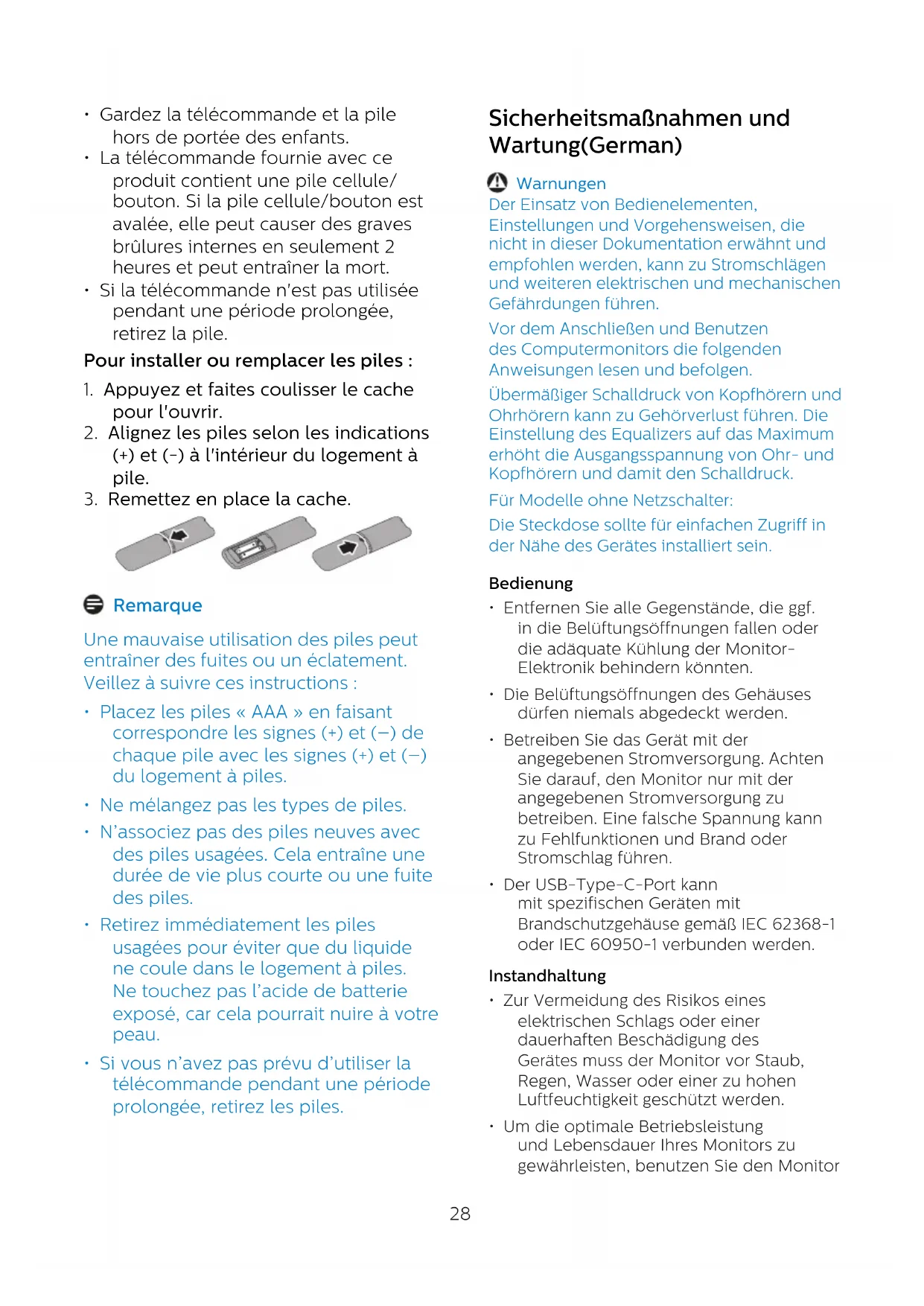 - Si vous n’avez pas prévu d’utiliser la télécommande pendant une période prolongée, retirez les piles. Sicherheitsmaßnahmen und Wartung(German) Warnungen Der Einsatz von Bedienelementen, Einstellungen und Vorgehensweisen, die nicht in dieser Dokumentation erwähnt und empfohlen werden, kann zu Stromschlägen und weiteren elektrischen und mechanischen Gefährdungen führen. Vor dem Anschließen und Benutzen des Computermonitors die folgenden Anweisungen lesen und befolgen. Übermäßiger Schalldruck von Kopfhörern und Ohrhörern kann zu Gehörverlust führen. Die Einstellung des Equalizers auf das Maximum erhöht die Ausgangsspannung von Ohr- und Kopfhörern und damit den Schalldruck. Für Modelle ohne Netzschalter: Die Steckdose sollte für einfachen Zugriff in der Nähe des Gerätes installiert sein. Bedienung