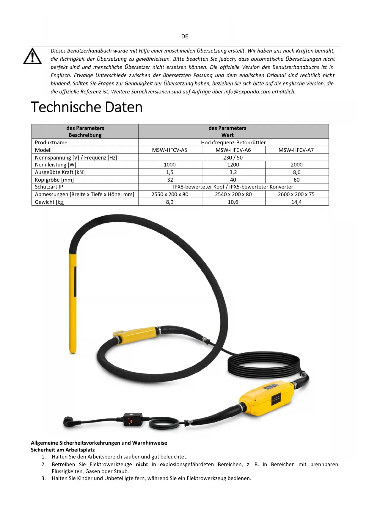 Dieses Benutzerhandbuch wurde mit Hilfe einer maschinellen Übersetzung erstellt. Wir haben uns nach Kräften bemüht, die Richtigkeit der Übersetzung zu gewährleisten. Bitte beachten Sie jedoch, dass automatische Übersetzungen nicht perfekt sind und menschliche Übersetzer nicht ersetzen können. Die offizielle Version des Benutzerhandbuchs ist in Englisch. Etwaige Unterschiede zwischen der übersetzten Fassung und dem englischen Original sind rechtlich nicht bindend. Sollten Sie Fragen zur Genauigkeit der Übersetzung haben, beziehen Sie sich bitte auf die englische Version, die die offizielle Referenz ist. Weitere Sprachversionen sind auf Anfrage über info@expondo.com erhältlich. Technische Daten des Parameters Beschreibung des Parameters Wert Produktname Hochfrequenz-Betonrüttler Modell MSW-HFCV-A5 MSW-HFCV-A6 MSW-HFCV-A7 Nennspannung [V] / Frequenz [Hz] 230 / 50 Nennleistung [W]
