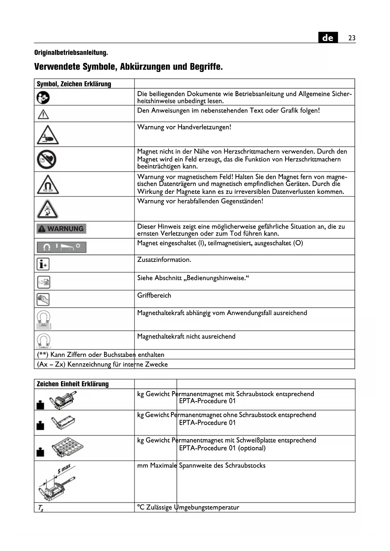Originalbetriebsanleitung.Übersetzung der Originalbetriebsanleitung. Verwendete Symbole, Abkürzungen und Begriffe. Symbol, Zeichen Erklärung Die beiliegenden Dokumente wie Betriebsanleitung und Allgemeine Sicher- heitshinweise unbedingt lesen. Den Anweisungen im nebenstehenden Text oder Grafik folgen! Warnung vor Handverletzungen! Magnet nicht in der Nähe von Herzschrittmachern verwenden. Durch den Magnet wird ein Feld erzeugt, das die Funktion von Herzschrittmachern beeinträchtigen kann. Warnung vor magnetischem Feld! Halten Sie den Magnet fern von magne- tischen Datenträgern und magnetisch empfindlichen Geräten. Durch die Wirkung der Magnete kann es zu irreversiblen Datenverlusten kommen. Warnung vor herabfallenden Gegenständen! Dieser Hinweis zeigt eine möglicherweise gefährliche Situation an, die zu ernsten Verletzungen oder zum Tod führen kann. Magnet eingeschaltet (I), teilmagnetisiert, ausgeschaltet (O) Zusatzinformation. Siehe Abschnitt „Bedienungshinweise.“ Griffbereich Magnethaltekraft abhängig vom Anwendungsfall ausreichend Magnethaltekraft nicht ausreichend (**) Kann Ziffern oder Buchstaben enthalten (Ax – Zx) Kennzeichnung für interne Zwecke WARNUNG Zeichen Einheit Erklärung kg Gewicht Permanentmagnet mit Schraubstock entsprechend EPTA-Procedure 01 kg Gewicht Permanentmagnet ohne Schraubstock entsprechend EPTA-Procedure 01 kg Gewicht Permanentmagnet mit Schweißplatte entsprechend EPTA-Procedure 01 (optional) mm Maximale Spannweite des Schraubstocks