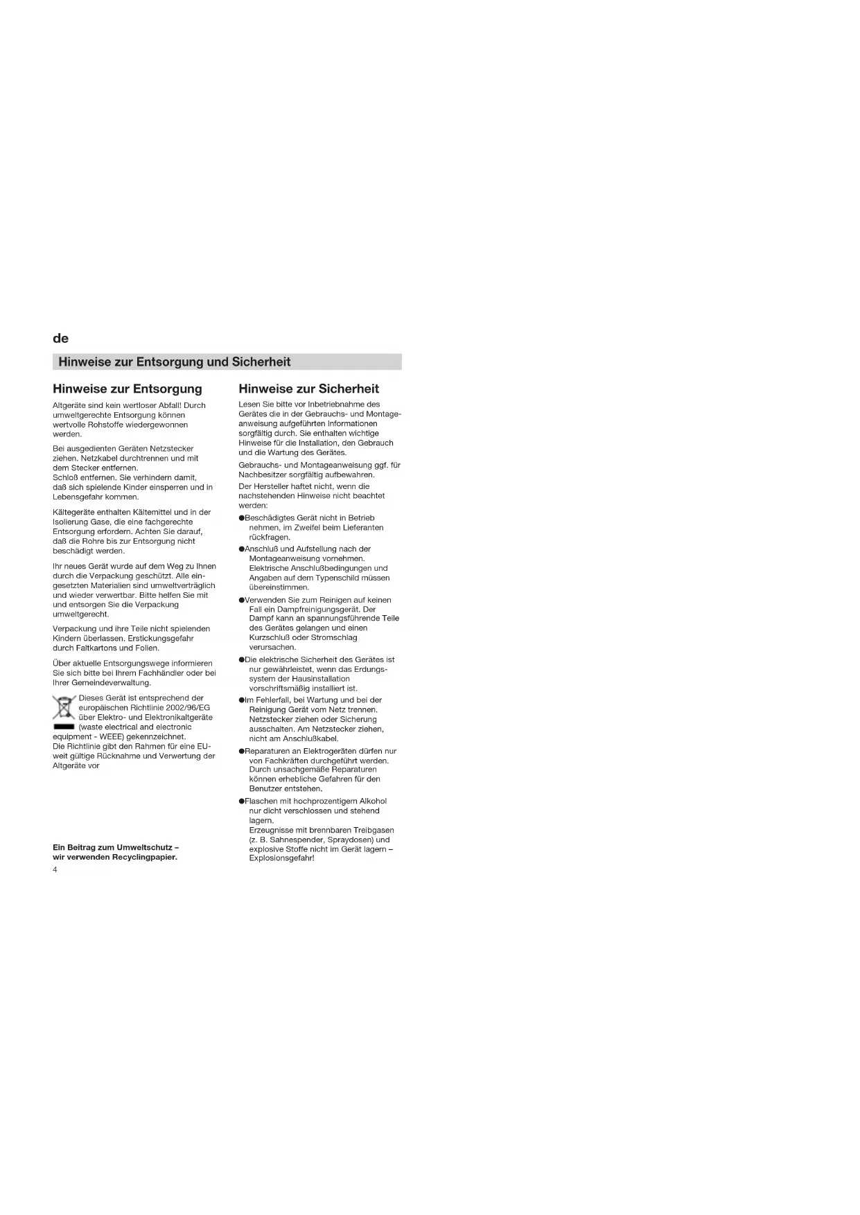 Hinweise zur Entsorgung und Sicherheit Hinweise zur Entsorgung Altgeräte sind kein wertloser Abfall! Durch umweltgerechte Entsorgung können wertvolle Rohstoffe wiedergewonnen werden. Bei ausgedienten Geräten Netzstecker ziehen. Netzkabel durchtrennen und mit dem Stecker entfernen. Schloß entfernen. Sie verhindern damit, daß sich spielende Kinder einsperren und in Lebensgefahr kommen. Kältegeräte enthalten Kältemittel und in der Isolierung Gase, die eine fachgerechte Entsorgung erfordern. Achten Sie darauf, daß die Rohre bis zur Entsorgung nicht beschädigt werden. Ihr neues Gerät wurde auf dem Weg zu Ihnen durch die Verpackung geschützt. Alle ein- gesetzten Materialien sind umweltverträglich und wieder verwertbar. Bitte helfen Sie mit und entsorgen Sie die Verpackung umweltgerecht. Verpackung und ihre Teile nicht spielenden Kindern überlassen. Erstickungsgefahr durch Faltkartons und Folien. Über aktuelle Entsorgungswege informieren Sie sich bitte bei Ihrem Fachhändler oder bei Ihrer Gemeindeverwaltung. Dieses Gerät ist entsprechend der europäischen Richtlinie 2002/96/EG über Elektro- und Elektronikaltgeräte (waste electrical and electronic equipment - WEEE) gekennzeichnet. Die Richtlinie gibt den Rahmen für eine EU- weit gültige Rücknahme und Verwertung der Altgeräte vor Ein Beitrag zum Umweltschutz – wir verwenden Recyclingpapier. Hinweise zur Sicherheit Lesen Sie bitte vor Inbetriebnahme des Gerätes die in der Gebrauchs- und Montage- anweisung aufgeführten Informationen sorgfältig durch. Sie enthalten wichtige Hinweise für die Installation, den Gebrauch und die Wartung des Gerätes. Gebrauchs- und Montageanweisung ggf. für Nachbesitzer sorgfältig aufbewahren. Der Hersteller haftet nicht, wenn die nachstehenden Hinweise nicht beachtet werden: ● Beschädigtes Gerät nicht in Betrieb nehmen, im Zweifel beim Lieferanten rückfragen. ● Anschluß und Aufstellung nach der Montageanweisung vornehmen. Elektrische Anschlußbedingungen und Angaben auf dem Typenschild müssen übereinstimmen. ● Verwenden Sie zum Reinigen auf keinen Fall ein Dampfreinigungsgerät. Der Dampf kann an spannungsführende Teile des Gerätes gelangen und einen Kurzschluß oder Stromschlag verursachen. ● Die elektrische Sicherheit des Gerätes ist nur gewährleistet, wenn das Erdungs- system der Hausinstallation vorschriftsmäßig installiert ist. ● Im Fehlerfall, bei Wartung und bei der Reinigung Gerät vom Netz trennen. Netzstecker ziehen oder Sicherung ausschalten. Am Netzstecker ziehen, nicht am Anschlußkabel. ● Reparaturen an Elektrogeräten dürfen nur von Fachkräften durchgeführt werden. Durch unsachgemäße Reparaturen können erhebliche Gefahren für den Benutzer entstehen. ● Flaschen mit hochprozentigem Alkohol nur dicht verschlossen und stehend lagern. Erzeugnisse mit brennbaren Treibgasen (z. B. Sahnespender, Spraydosen) und explosive Stoffe nicht im Gerät lagern – Explosionsgefahr!5 Bestimmungen Das Gerät eignet sich zum Kühlen und Gefrieren von Lebensmitteln und zur Eis- bereitung. Es ist für die Verwendung im Haushalt bestimmt. Bei Einsatz im gewerblichen Bereich sind die für das Gewerbe gültigen Bestimmungen zu beachten. Es entspricht der Unfallverhütungsvorschrift für Kälteanlagen (VBG 20). Es entspricht den einschlägigen Sicherheitsbestimmungen für Elektrogeräte. Der Kältekreislauf ist auf Dichtheit geprüft. Umgebungstemperatur beachten Abhängig von der „Klimaklasse“ (siehe Typenschild) kann Ihr Gerät bei folgenden Umgebungstemperaturen betrieben werden: (Das Typenschild befindet sich links unten im Gerät. Bild