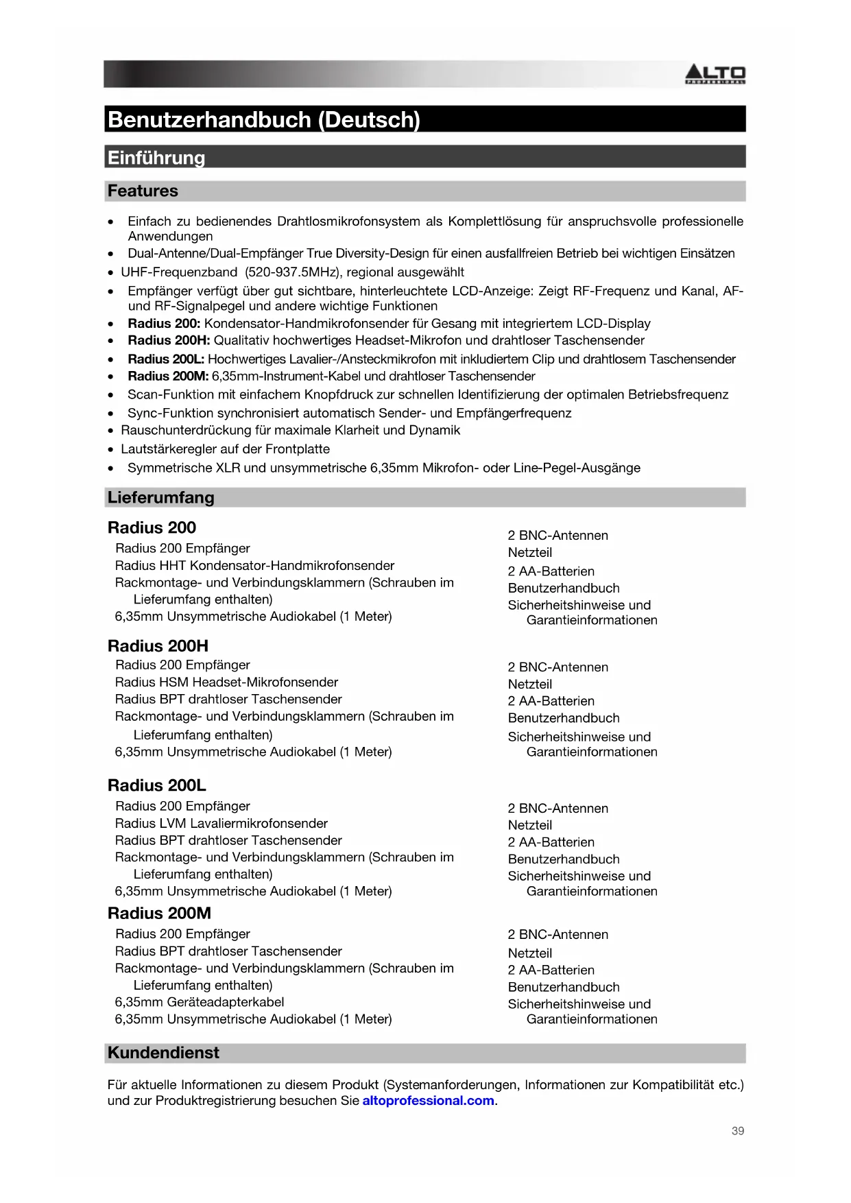 Radius 200L - Mikrofon ALTO - Kostenlose Bedienungsanleitung