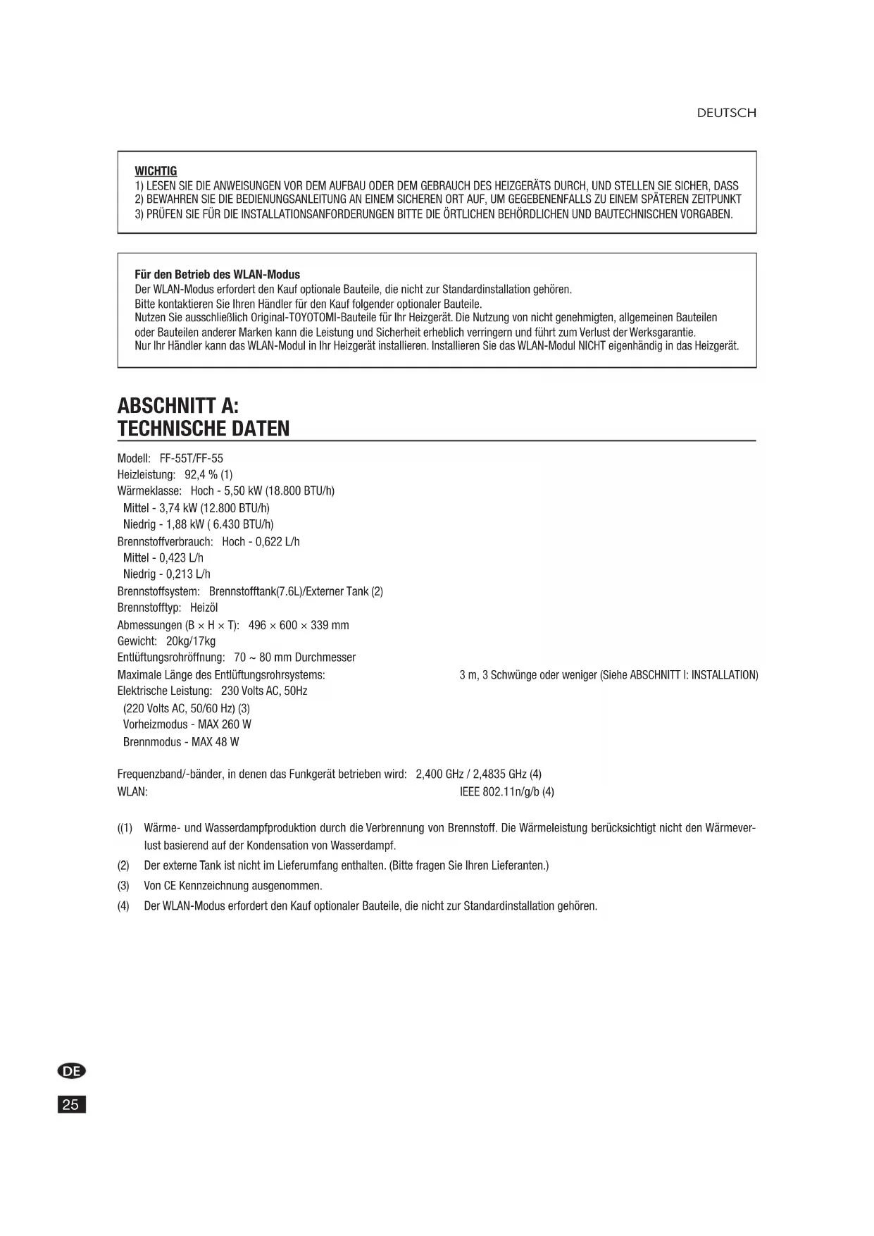 Für den Betrieb des WLAN-Modus Der WLAN-Modus erfordert den Kauf optionale Bauteile, die nicht zur Standardinstallation gehören. Bitte kontaktieren Sie Ihren Händler für den Kauf folgender optionaler Bauteile. Nutzen Sie ausschließlich Original-TOYOTOMI-Bauteile für Ihr Heizgerät. Die Nutzung von nicht genehmigten, allgemeinen Bauteilen oder Bauteilen anderer Marken kann die Leistung und Sicherheit erheblich verringern und führt zum Verlust der Werksgarantie. Nur Ihr Händler kann das WLAN-Modul in Ihr Heizgerät installieren. Installieren Sie das WLAN-Modul NICHT eigenhändig in das Heizgerät. ABSCHNITT A: TECHNISCHE DATEN Modell: FF-55T/FF-55 Heizleistung: 92,4 % (1) Wärmeklasse: Hoch - 5,50 kW (18.800 BTU/h) Mittel - 3,74 kW (12.800 BTU/h) Niedrig - 1,88 kW ( 6.430 BTU/h) Brennstoffverbrauch: Hoch - 0,622 L/h Mittel - 0,423 L/h Niedrig - 0,213 L/h Brennstoffsystem: Brennstofftank(7.6L)/Externer Tank (2) Brennstofftyp: Heizöl Abmessungen (B × H × T): 496 × 600 × 339 mm Gewicht: 20kg/17kg Entlüftungsrohröffnung: 70 ~ 80 mm Durchmesser Maximale Länge des Entlüftungsrohrsystems: 3 m, 3 Schwünge oder weniger (Siehe ABSCHNITT I: INSTALLATION) Elektrische Leistung: 230 Volts AC, 50Hz (220 Volts AC, 50/60 Hz) (3) Vorheizmodus - MAX 260 W Brennmodus - MAX 48 W Frequenzband/-bänder, in denen das Funkgerät betrieben wird: 2,400 GHz / 2,4835 GHz (4) WLAN: IEEE 802.11n/g/b (4) ((1) Wärme- und Wasserdampfproduktion durch die Verbrennung von Brennstoff. Die Wärmeleistung berücksichtigt nicht den Wärmever- lust basierend auf der Kondensation von Wasserdampf. (2) Der externe Tank ist nicht im Lieferumfang enthalten. (Bitte fragen Sie Ihren Lieferanten.) (3) Von CE Kennzeichnung ausgenommen. (4) Der WLAN-Modus erfordert den Kauf optionaler Bauteile, die nicht zur Standardinstallation gehören.DE