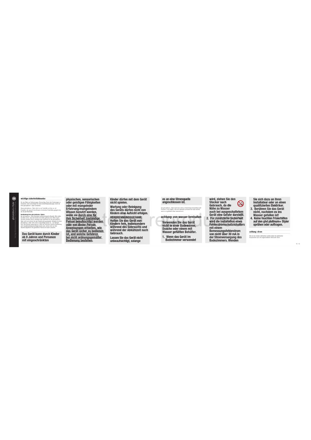 ghd platinum+ Styler Wichtige Sicherheitsanweisungen und Herstellergarantie wichtige sicherheitshinweise Um das Risiko von Verbrennungen, Stromschlag, Brand oder Verletzungen zu reduzieren, lesen und befolgen Sie diese Sicherheitsanweisungen, bevor Sie Ihren ghd platinum+ Styler verwenden.Dieser ghd platinum+ Styler dient nur als Frisierhilfe und dies nur mit Produkten, die eigens für den Einsatz mit beheizten Frisierhilfen geeignet sind, wie die ghd Hitzematte.Handhabung Ihres ghd platinum+ StylersDer ghd platinum+ Styler beinhaltet hochtechnologische Bauteile. Bitte stellen Sie daher sicher, dass das Produkt nicht fallen gelassen wird. Bitte bringen Sie keine fremden Teile an. Bemalen oder verbrennen Sie den ghd platinum+ Styler nicht und nehmen Sie das Produkt nicht auseinander. Benutzen Sie Ihren ghd platinum+ Styler nicht, wenn er beschädigt worden ist – zum Beispiel wenn das Gehäuse gesprungen ist. Sollte das Gerät durch falsche Handhabung oder Gewalteinwirkung beschädigt worden sein, ist dies nicht von Ihrer Garantie abgedeckt. Ihre gesetzlichen Rechte sind davon unberührt. Das Gerät kann durch Kinder ab 8 Jahren und Personen mit eingeschränkten physischen, sensorischen oder geistigen Fähigkeiten oder mit mangelnder Erfahrung/mangelndem Wissen benutzt werden, wenn sie durch eine für ihre Sicherheit zuständige Person beaufsichtigt werden oder von dieser Person Anweisungen erhielten, wie das Gerät sicher zu bedienen ist, und welche Gefahren bei nicht ordnungsgemäßer Bedienung bestehen. Kinder dürfen mit dem Gerät nicht spielen. Wartung oder Reinigung des Geräts dürfen nicht von Kindern ohne Aufsicht erfolgen. VERBRENNUNGSGEFAHR: Halten Sie das Gerät von Kindern fern, insbesondere während des Gebrauchs und während der Abkühlzeit nach Gebrauch. Lassen Sie das Gerät nicht unbeaufsichtigt, solange