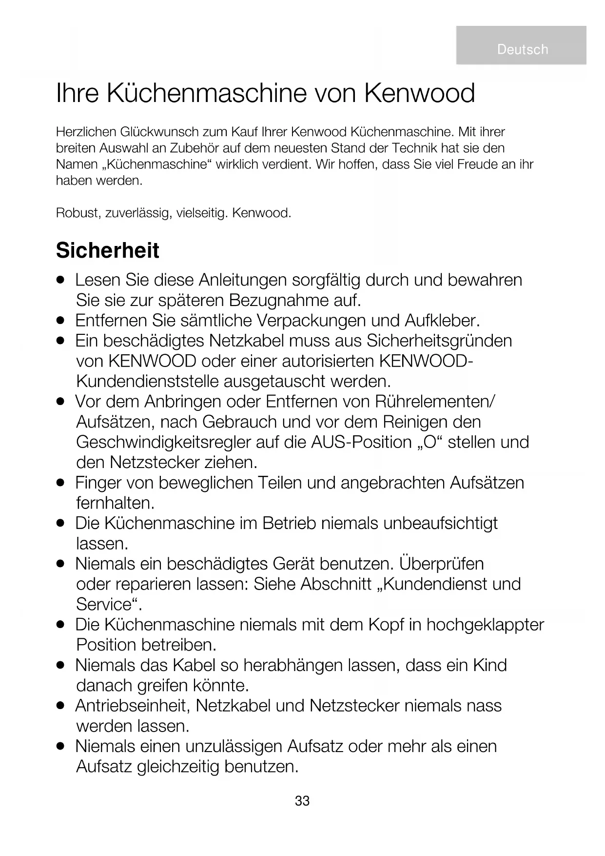 Niemals einen unzulässigen Aufsatz oder mehr als einen Aufsatz gleichzeitig benutzen. Deutsch Ihre Küchenmaschine von Kenwood Herzlichen Glückwunsch zum Kauf Ihrer Kenwood Küchenmaschine. Mit ihrer breiten Auswahl an Zubehör auf dem neuesten Stand der Technik hat sie den Namen „Küchenmaschine“ wirklich verdient. Wir hoffen, dass Sie viel Freude an ihr haben werden. Robust, zuverlässig, vielseitig. Kenwood.34