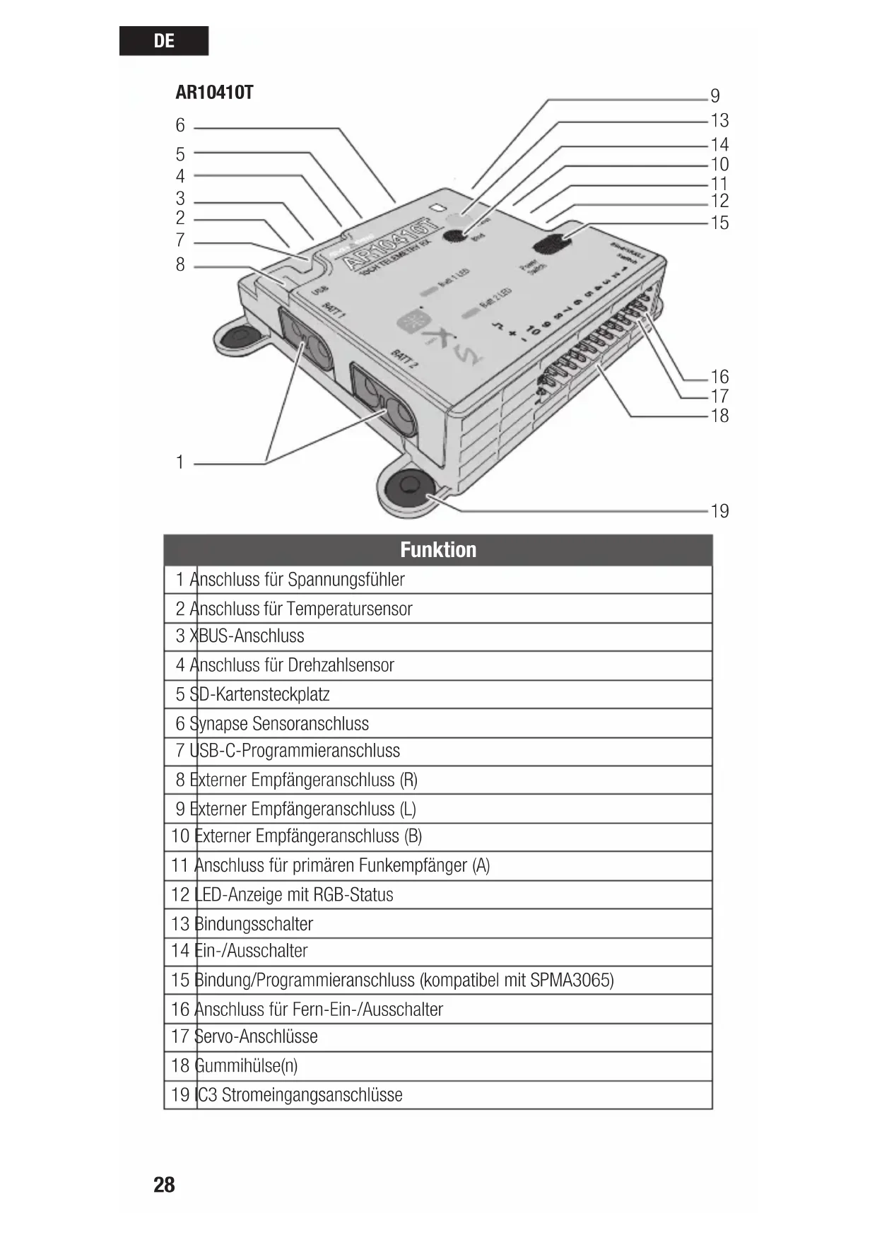 Funktion 1 Anschluss für Spannungsfühler 2 Anschluss für Temperatursensor 3 XBUS-Anschluss 4 Anschluss für Drehzahlsensor 5 SD-Kartensteckplatz 6 Synapse Sensoranschluss 7 USB-C-Programmieranschluss 8 Externer Empfängeranschluss (R) 9 Externer Empfängeranschluss (L) 10 Externer Empfängeranschluss (B) 11 Anschluss für primären Funkempfänger (A) 12 LED-Anzeige mit RGB-Status 13 Bindungsschalter 14 Ein-/Ausschalter 15 Bindung/Programmieranschluss (kompatibel mit SPMA3065) 16 Anschluss für Fern-Ein-/Ausschalter 17 Servo-Anschlüsse 18 Gummihülse(n) 19 IC3 Stromeingangsanschlüsse