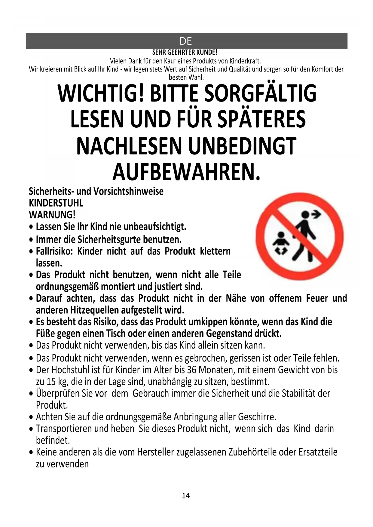 NACHLESEN UNBEDINGT AUFBEWAHREN. Sicherheits- und Vorsichtshinweise KINDERSTUHL WARNUNG!