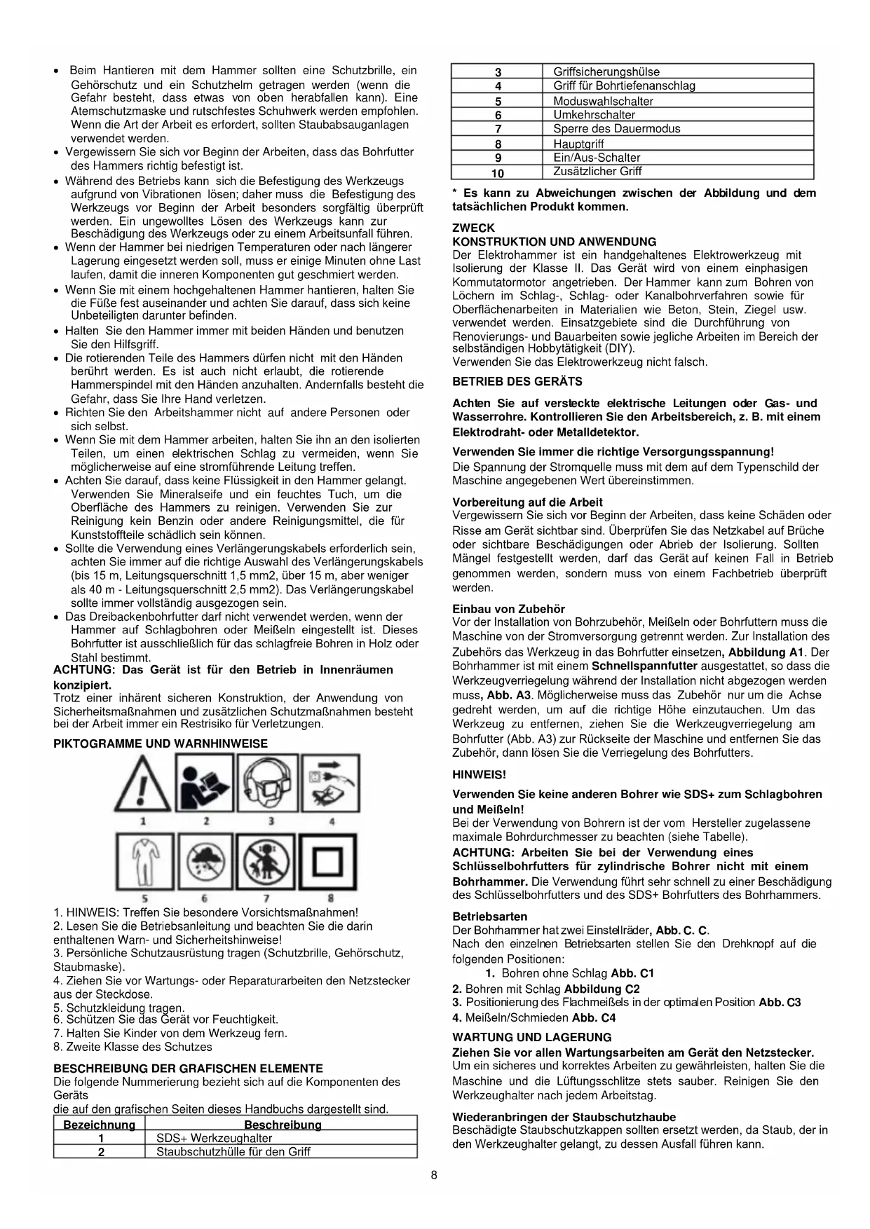 - Das Dreibackenbohrfutter darf nicht verwendet werden, wenn der Hammer auf Schlagbohren oder Meißeln eingestellt ist. Dieses Bohrfutter ist ausschließlich für das schlagfreie Bohren in Holz oder Stahl bestimmt. ACHTUNG: Das Gerät ist für den Betrieb in Innenräumen konzipiert. Trotz einer inhärent sicheren Konstruktion, der Anwendung von Sicherheitsmaßnahmen und zusätzlichen Schutzmaßnahmen besteht bei der Arbeit immer ein Restrisiko für Verletzungen.