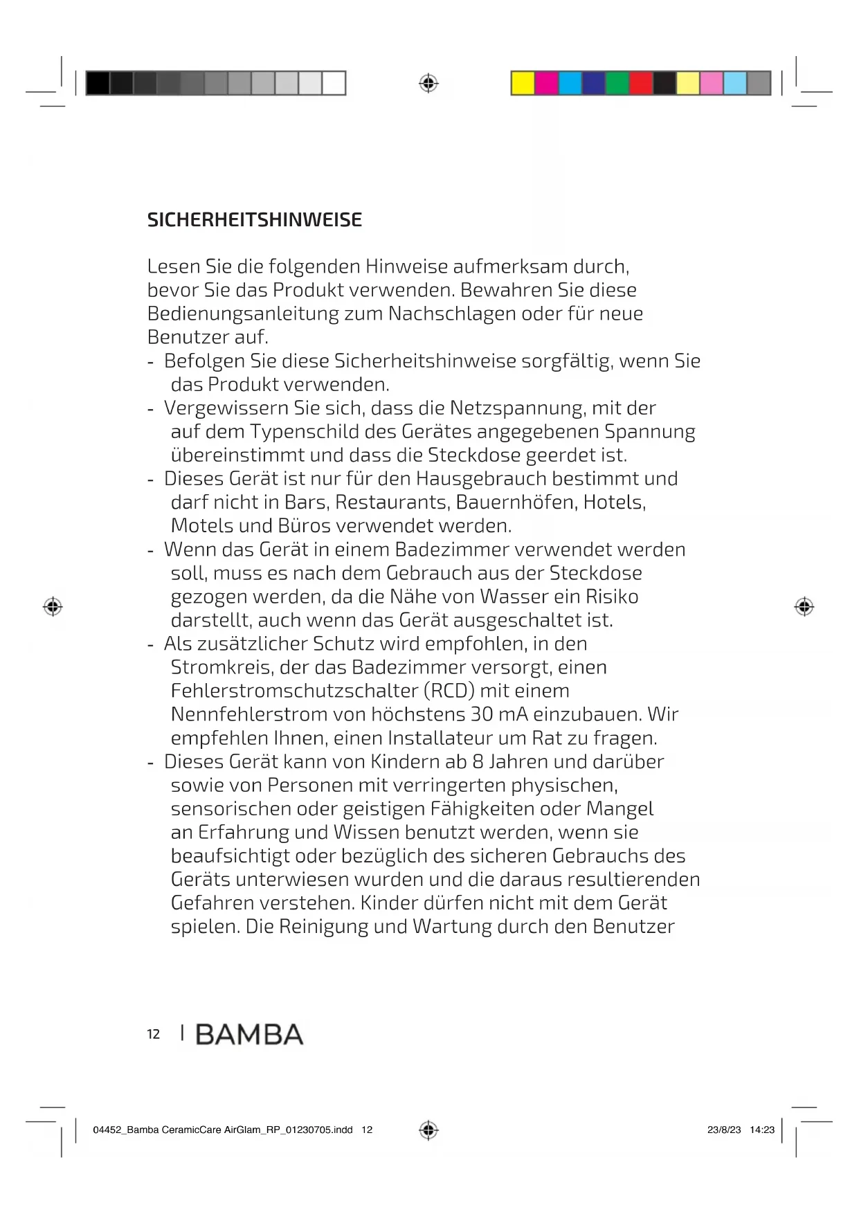 Veuillez lire les instructions suivantes avec attention avant d’utiliser l’appareil. Gardez bien ce manuel pour de futures références ou pour tout nouvel utilisateur. - Veuillez suivre ces instructions de sécurité très attentivement lorsque vous utilisez l’appareil. - Assurez-vous que le voltage du réseau coïncide avec le voltage spécié sur l’étiquette de classication de l’appareil et que la prise possède une connexion à terre. - Cet appareil est conçu pour un usage domestique uniquement et ne doit pas être utilisé dans les bars, restaurants, fermes, hôtels, motels et bureaux. - Lorsque l’appareil doit être utilisé dans une salle de bain, il doit être débranché de la prise après utilisation, car la proximité de l’eau présente un risque même lorsque l’appareil est éteint. - Comme protection supplémentaire, il est recommandé d’installer sur le circuit électrique alimentant la salle de bain un dispositif à courant résiduel (RCD) dont le courant de défaut nominal de fonctionnement ne dépasse pas 30 mA. Il est recommandé de demander conseil à un installateur. - Cet appareil peut être utilisé par des enfants de 8 ans et plus et par des personnes aux capacités physiques, mentales ou sensorielles réduites, ou sans expérience ni connaissances s’ils sont surveillés et/ou ont reçu les informations nécessaires à l’utilisation correcte de l’appareil et qu’ils ont bien compris les risques qu’il implique. Empêchez les enfants de jouer avec le produit. Le nettoyage et l’entretien du produit ne peuvent pas être menés à terme par les enfants. 04452_Bamba CeramicCare AirGlam_RP_01230705.indd 904452_Bamba CeramicCare AirGlam_RP_01230705.indd 9 23/8/23 14:2323/8/23 14:2310 - Cette icône signie que cet appareil ne doit pas être utilisé dans une baignoire, une douche ou un récipient rempli d’eau. - AVERTISSEMENT: n’utilisez pas cet appareil près de baignoires, de douches, de lavabos ou d’autres récipients contenant de l’eau. - Ne submergez ni le câble, ni la che ni aucune autre partie du produit dans de l’eau ni dans aucun autre liquide, ni n’exposez les connexions électriques à l’eau. Assurez-vous d’avoir les mains complètement sèches avant de toucher la prise ou d’allumer l’appareil. - Ce symbole signie : attention, surface chaude. - Inspectez le câble d’alimentation régulièrement pour rechercher des dommages visibles. Si le câble présente des dommages, il doit être remplacé par le Service d’Assistance Technique ociel de Cecotec pour éviter tout type de danger. - Assurez-vous que l’entrée comme la sortie d’air ne soient pas bloquées. - Éteignez et débranchez l’appareil de la prise de courant immédiatement après l’avoir utilisé. - Débranchez l’appareil immédiatement: - s’il ne fonctionne pas bien; - s’il doit être nettoyé; - après son utilisation. - N’introduisez pas d’objets métalliques par les entrées d’air an d’éviter des décharges électriques. - N’enroulez pas le câble autour de l’appareil. - Évitez le contact entre l’appareil et le visage, le cou et le cuir chevelu. 04452_Bamba CeramicCare AirGlam_RP_01230705.indd 1004452_Bamba CeramicCare AirGlam_RP_01230705.indd 10 23/8/23 14:2323/8/23 14:2311 Bamba CeramicCare AirGlam - Ne laissez l’appareil sur aucune surface lorsqu’il est en fonctionnement. - N’utilisez pas l’appareil pour coier des perruques, des extensions naturelles, des cheveux articiels ou des poils d’animaux. - L’entrée d’air sert à ventiler l’appareil. Ne la couvrez pas et ne l’obstruez pas, car cela pourrait entraîner une surchaue. - N’insérez rien dans l’entrée d’air. 04452_Bamba CeramicCare AirGlam_RP_01230705.indd 1104452_Bamba CeramicCare AirGlam_RP_01230705.indd 11 23/8/23 14:2323/8/23 14:2312 SICHERHEITSHINWEISE Lesen Sie die folgenden Hinweise aufmerksam durch, bevor Sie das Produkt verwenden. Bewahren Sie diese Bedienungsanleitung zum Nachschlagen oder für neue Benutzer auf. - Befolgen Sie diese Sicherheitshinweise sorgfältig, wenn Sie das Produkt verwenden. - Vergewissern Sie sich, dass die Netzspannung, mit der auf dem Typenschild des Gerätes angegebenen Spannung übereinstimmt und dass die Steckdose geerdet ist. - Dieses Gerät ist nur für den Hausgebrauch bestimmt und darf nicht in Bars, Restaurants, Bauernhöfen, Hotels, Motels und Büros verwendet werden. - Wenn das Gerät in einem Badezimmer verwendet werden soll, muss es nach dem Gebrauch aus der Steckdose gezogen werden, da die Nähe von Wasser ein Risiko darstellt, auch wenn das Gerät ausgeschaltet ist. - Als zusätzlicher Schutz wird empfohlen, in den Stromkreis, der das Badezimmer versorgt, einen Fehlerstromschutzschalter (RCD) mit einem Nennfehlerstrom von höchstens 30 mA einzubauen. Wir empfehlen Ihnen, einen Installateur um Rat zu fragen. - Dieses Gerät kann von Kindern ab 8 Jahren und darüber sowie von Personen mit verringerten physischen, sensorischen oder geistigen Fähigkeiten oder Mangel an Erfahrung und Wissen benutzt werden, wenn sie beaufsichtigt oder bezüglich des sicheren Gebrauchs des Geräts unterwiesen wurden und die daraus resultierenden Gefahren verstehen. Kinder dürfen nicht mit dem Gerät spielen. Die Reinigung und Wartung durch den Benutzer 04452_Bamba CeramicCare AirGlam_RP_01230705.indd 1204452_Bamba CeramicCare AirGlam_RP_01230705.indd 12 23/8/23 14:2323/8/23 14:2313 Bamba CeramicCare AirGlam darf nicht von unbeaufsichtigten Kindern durchgeführt werden. - Dieses Symbol bedeutet, dass dieses Gerät nicht in einer Badewanne, Dusche oder einem mit Wasser gefüllten Tank verwendet werden darf. - HINWEIS: Verwenden Sie dieses Gerät nicht in der Nähe von Badewannen, Duschen, Waschbecken oder anderen Gefäßen, die Wasser enthalten. - Tauchen Sie das Netzkabel, den Stecker oder jegliche nicht entfernbaren Teile des Gerätes nicht ins Wasser oder andere Flüssigkeiten ein und lassen Sie die elektrisc