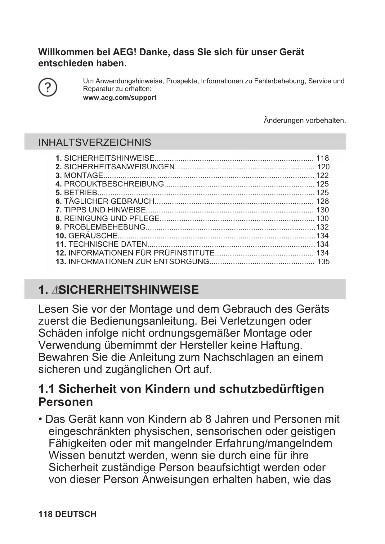 - Das Gerät kann von Kindern ab 8 Jahren und Personen mit eingeschränkten physischen, sensorischen oder geistigen Fähigkeiten oder mit mangelnder Erfahrung/mangelndem Wissen benutzt werden, wenn sie durch eine für ihre Sicherheit zuständige Person beaufsichtigt werden oder von dieser Person Anweisungen erhalten haben, wie das 118 DEUTSCHGerät sicher zu bedienen ist und welche Gefahren bei nicht ordnungsgemäßer Bedienung bestehen.
