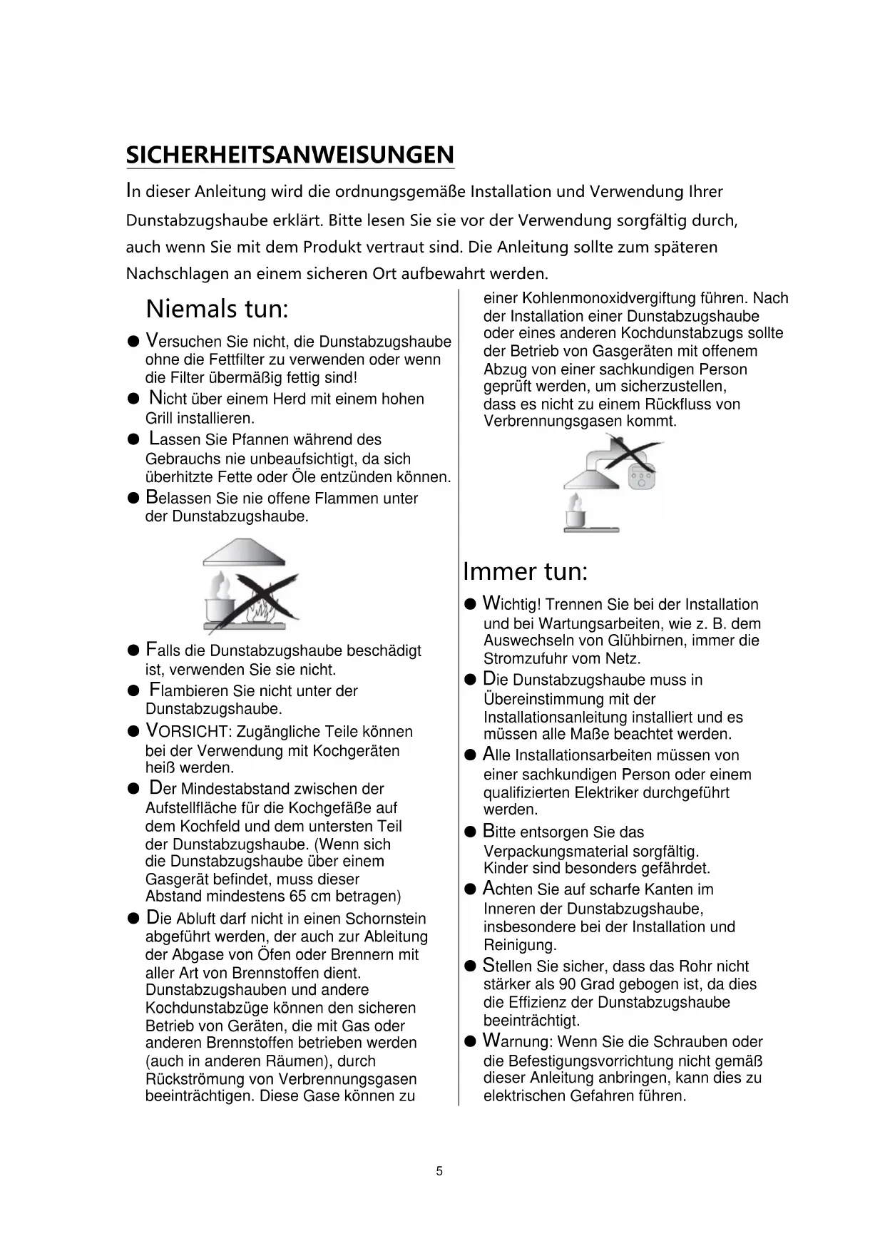 58SICHERHEITSANWEISUNGEN In dieser Anleitung wird die ordnungsgemäße Installation und Verwendung Ihrer Dunstabzugshaube erklärt. Bitte lesen Sie sie vor der Verwendung sorgfältig durch, auch wenn Sie mit dem Produkt vertraut sind. Die Anleitung sollte zum späteren Nachschlagen an einem sicheren Ort aufbewahrt werden. Niemals tun: ● Versuchen Sie nicht, die Dunstabzugshaube ohne die Fettfilter zu verwenden oder wenn die Filter übermäßig fettig sind! ● Nicht über einem Herd mit einem hohen Grill installieren. ● Lassen Sie Pfannen während des Gebrauchs nie unbeaufsichtigt, da sich überhitzte Fette oder Öle entzünden können. ● Belassen Sie nie offene Flammen unter der Dunstabzugshaube. ● Falls die Dunstabzugshaube beschädigt ist, verwenden Sie sie nicht. ● Flambieren Sie nicht unter der Dunstabzugshaube. ● VORSICHT: Zugängliche Teile können bei der Verwendung mit Kochgeräten heiß werden. ● Der Mindestabstand zwischen der Aufstellfläche für die Kochgefäße auf dem Kochfeld und dem untersten Teil der Dunstabzugshaube. (Wenn sich die Dunstabzugshaube über einem Gasgerät befindet, muss dieser Abstand mindestens 65 cm betragen) ● Die Abluft darf nicht in einen Schornstein abgeführt werden, der auch zur Ableitung der Abgase von Öfen oder Brennern mit aller Art von Brennstoffen dient. Dunstabzugshauben und andere Kochdunstabzüge können den sicheren Betrieb von Geräten, die mit Gas oder anderen Brennstoffen betrieben werden (auch in anderen Räumen), durch Rückströmung von Verbrennungsgasen beeinträchtigen. Diese Gase können zu einer Kohlenmonoxidvergiftung führen. Nach der Installation einer Dunstabzugshaube oder eines anderen Kochdunstabzugs sollte der Betrieb von Gasgeräten mit offenem Abzug von einer sachkundigen Person geprüft werden, um sicherzustellen, dass es nicht zu einem Rückfluss von Verbrennungsgasen kommt. Immer tun: ● Wichtig! Trennen Sie bei der Installation und bei Wartungsarbeiten, wie z. B. dem Auswechseln von Glühbirnen, immer die Stromzufuhr vom Netz. ● Die Dunstabzugshaube muss in Übereinstimmung mit der Installationsanleitung installiert und es müssen alle Maße beachtet werden. ● Alle Installationsarbeiten müssen von einer sachkundigen Person oder einem qualifizierten Elektriker durchgeführt werden. ● Bitte entsorgen Sie das Verpackungsmaterial sorgfältig. Kinder sind besonders gefährdet. ● Achten Sie auf scharfe Kanten im Inneren der Dunstabzugshaube, insbesondere bei der Installation und Reinigung. ● Stellen Sie sicher, dass das Rohr nicht stärker als 90 Grad gebogen ist, da dies die Effizienz der Dunstabzugshaube beeinträchtigt. ● Warnung: Wenn Sie die Schrauben oder die Befestigungsvorrichtung nicht gemäß dieser Anleitung anbringen, kann dies zu elektrischen Gefahren führen. 59● Warnung: Bevor Sie Zugang zu den Klemmen haben, müssen alle Stromkreise unterbrochen werden. ● Ist die Nennspannung der Lampe geringer als die Nennspannung des Geräts, muss die Nennspannung der Lampe ebenfalls auf oder in der Nähe der Lampenfassung angegeben sein. Immer tun: ● Setzen Sie immer einen Deckel auf Töpfe und Pfannen, wenn Sie auf einem Gasherd kochen. ● Im Absaugmodus wird die Luft im Raum von der Dunstabzugshaube abgesaugt. Stellen Sie sicher, dass die Belüftungsmaßnahmen eingehalten werden. Die Dunstabzugshaube entfernt Gerüche aus dem Raum, nicht aber den Dampf. ● Wird die Dunstabzugshaube gleichzeitig mit Geräten verwendet, die mit Gas oder anderen Brennstoffen betrieben werden, muss eine ausreichende Belüftung des Raumes gewährleistet sein. ● Die Dunstabzugshaube ist nur für den Hausgebrauch bestimmt.