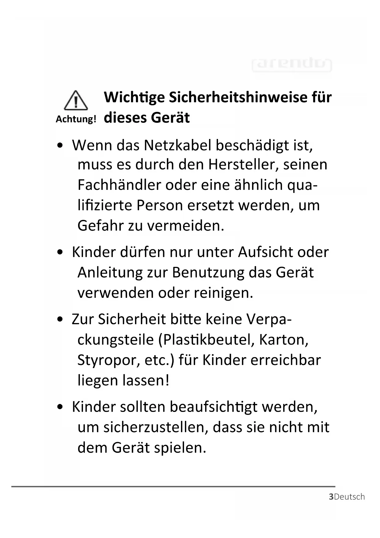 - Kinder sollten beaufsichgt werden, um sicherzustellen, dass sie nicht mit dem Gerät spielen. Achtung!4 Deutsch