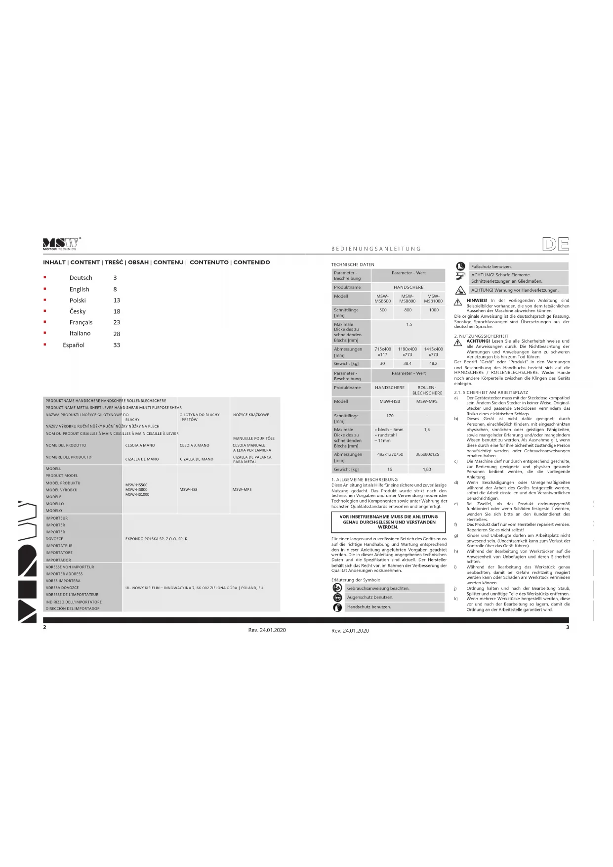 WERDEN. Für einen langen und zuverlässigen Betrieb des Geräts muss auf die richtige Handhabung und Wartung entsprechend den in dieser Anleitung angeführten Vorgaben geachtet werden. Die in dieser Anleitung angegebenen technischen Daten und die Spezikation sind aktuell. Der Hersteller behält sich das Recht vor, im Rahmen der Verbesserung der Qualität Änderungen vorzunehmen. Erläuterung der Symbole Parameter - Beschreibung Parameter - Wert Produktname HANDSCHERE ROLLEN- BLECHSCHERE Modell MSW-HS8 MSW-MPS Schnittlänge [mm]