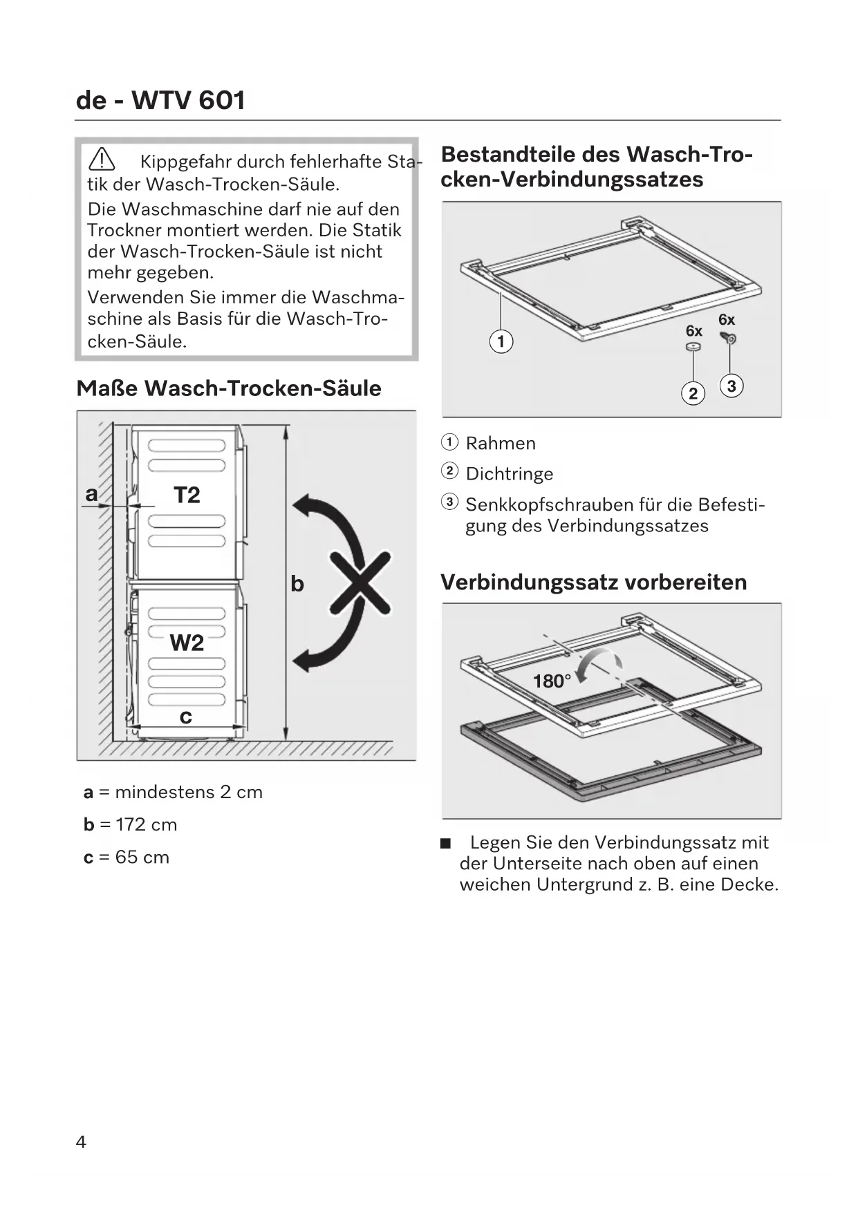 a = mindestens 2cm b = 172cm c = 65cm Bestandteile des Wasch-Tro- cken-Verbindungssatzes