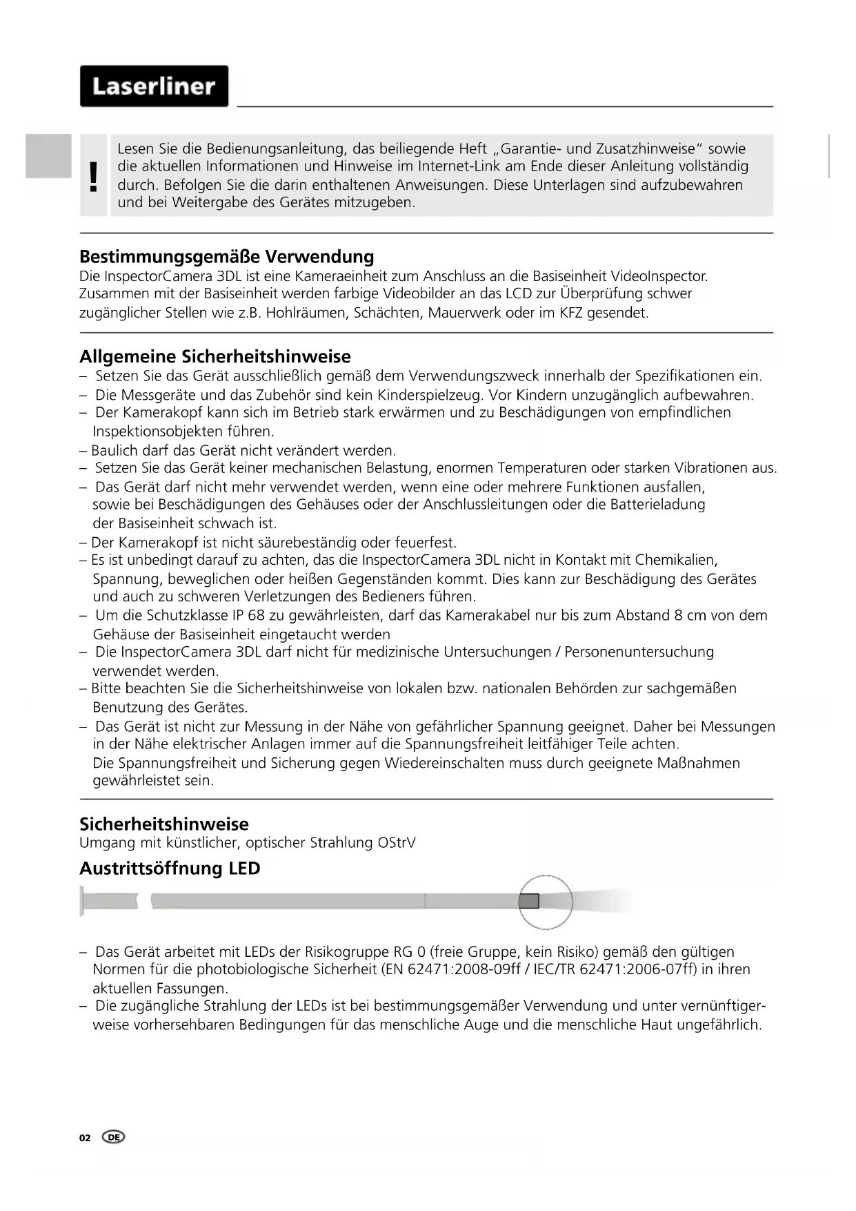 Sicherheitshinweise Umgang mit künstlicher, optischer Strahlung OStrV Austrittsöffnung LED – Das Gerät arbeitet mit LEDs der Risikogruppe RG 0 (freie Gruppe, kein Risiko) gemäß den gültigen Normen für die photobiologische Sicherheit (EN 62471:2008-09ff / IEC/TR 62471:2006-07ff) in ihren aktuellen Fassungen. – Die zugängliche Strahlung der LEDs ist bei bestimmungsgemäßer Verwendung und unter vernünftiger- weise vorhersehbaren Bedingungen für das menschliche Auge und die menschliche Haut ungefährlich. Allgemeine Sicherheitshinweise – Setzen Sie das Gerät ausschließlich gemäß dem Verwendungszweck innerhalb der Spezikationen ein. – Die Messgeräte und das Zubehör sind kein Kinderspielzeug. Vor Kindern unzugänglich aufbewahren. – Der Kamerakopf kann sich im Betrieb stark erwärmen und zu Beschädigungen von empndlichen Inspektionsobjekten führen. – Baulich darf das Gerät nicht verändert werden. – Setzen Sie das Gerät keiner mechanischen Belastung, enormen Temperaturen oder starken Vibrationen aus. – Das Gerät darf nicht mehr verwendet werden, wenn eine oder mehrere Funktionen ausfallen, sowie bei Beschädigungen des Gehäuses oder der Anschlussleitungen oder die Batterieladung der Basiseinheit schwach ist. – Der Kamerakopf ist nicht säurebeständig oder feuerfest. – Es ist unbedingt darauf zu achten, das die InspectorCamera 3DL nicht in Kontakt mit Chemikalien, Spannung, beweglichen oder heißen Gegenständen kommt. Dies kann zur Beschädigung des Gerätes und auch zu schweren Verletzungen des Bedieners führen. – Um die Schutzklasse IP 68 zu gewährleisten, darf das Kamerakabel nur bis zum Abstand 8 cm von dem Gehäuse der Basiseinheit eingetaucht werden – Die InspectorCamera 3DL darf nicht für medizinische Untersuchungen / Personenuntersuchung verwendet werden. – Bitte beachten Sie die Sicherheitshinweise von lokalen bzw. nationalen Behörden zur sachgemäßen Benutzung des Gerätes. – Das Gerät ist nicht zur Messung in der Nähe von gefährlicher Spannung geeignet. Daher bei Messungen in der Nähe elektrischer Anlagen immer auf die Spannungsfreiheit leitfähiger Teile achten. Die Spannungsfreiheit und Sicherung gegen Wiedereinschalten muss durch geeignete Maßnahmen gewährleistet sein. Bestimmungsgemäße Verwendung Die InspectorCamera 3DL ist eine Kameraeinheit zum Anschluss an die Basiseinheit VideoInspector. Zusammen mit der Basiseinheit werden farbige Videobilder an das LCD zur Überprüfung schwer zugänglicher Stellen wie z.B. Hohlräumen, Schächten, Mauerwerk oder im KFZ gesendet. DEInspectorCamera 3DL