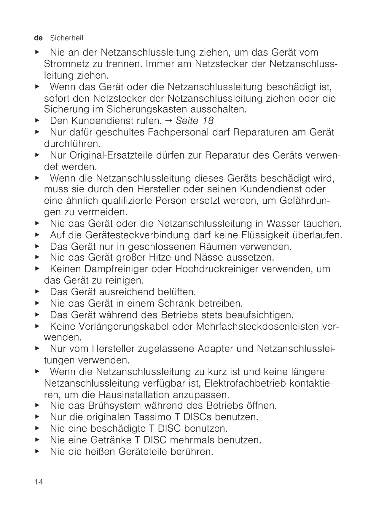 ▶ Nie an der Netzanschlussleitung ziehen, um das Gerät vom Stromnetz zu trennen. Immer am Netzstecker der Netzanschluss- leitung ziehen. ▶ Wenn das Gerät oder die Netzanschlussleitung beschädigt ist, sofort den Netzstecker der Netzanschlussleitung ziehen oder die Sicherung im Sicherungskasten ausschalten. ▶ Den Kundendienst rufen. →Seite18 ▶ Nur dafür geschultes Fachpersonal darf Reparaturen am Gerät durchführen. ▶ Nur Original-Ersatzteile dürfen zur Reparatur des Geräts verwen- det werden. ▶ Wenn die Netzanschlussleitung dieses Geräts beschädigt wird, muss sie durch den Hersteller oder seinen Kundendienst oder eine ähnlich qualifizierte Person ersetzt werden, um Gefährdun- gen zu vermeiden. ▶ Nie das Gerät oder die Netzanschlussleitung in Wasser tauchen. ▶ Auf die Gerätesteckverbindung darf keine Flüssigkeit überlaufen. ▶ Das Gerät nur in geschlossenen Räumen verwenden. ▶ Nie das Gerät großer Hitze und Nässe aussetzen. ▶ Keinen Dampfreiniger oder Hochdruckreiniger verwenden, um das Gerät zu reinigen. ▶ Das Gerät ausreichend belüften. ▶ Nie das Gerät in einem Schrank betreiben. ▶ Das Gerät während des Betriebs stets beaufsichtigen. ▶ Keine Verlängerungskabel oder Mehrfachsteckdosenleisten ver- wenden. ▶ Nur vom Hersteller zugelassene Adapter und Netzanschlusslei- tungen verwenden. ▶ Wenn die Netzanschlussleitung zu kurz ist und keine längere Netzanschlussleitung verfügbar ist, Elektrofachbetrieb kontaktie- ren, um die Hausinstallation anzupassen. ▶ Nie das Brühsystem während des Betriebs öffnen. ▶ Nur die originalen Tassimo TDISCs benutzen. ▶ Nie eine beschädigte T DISC benutzen. ▶ Nie eine Getränke T DISC mehrmals benutzen. ▶ Nie die heißen Geräteteile berühren.Übersicht de
