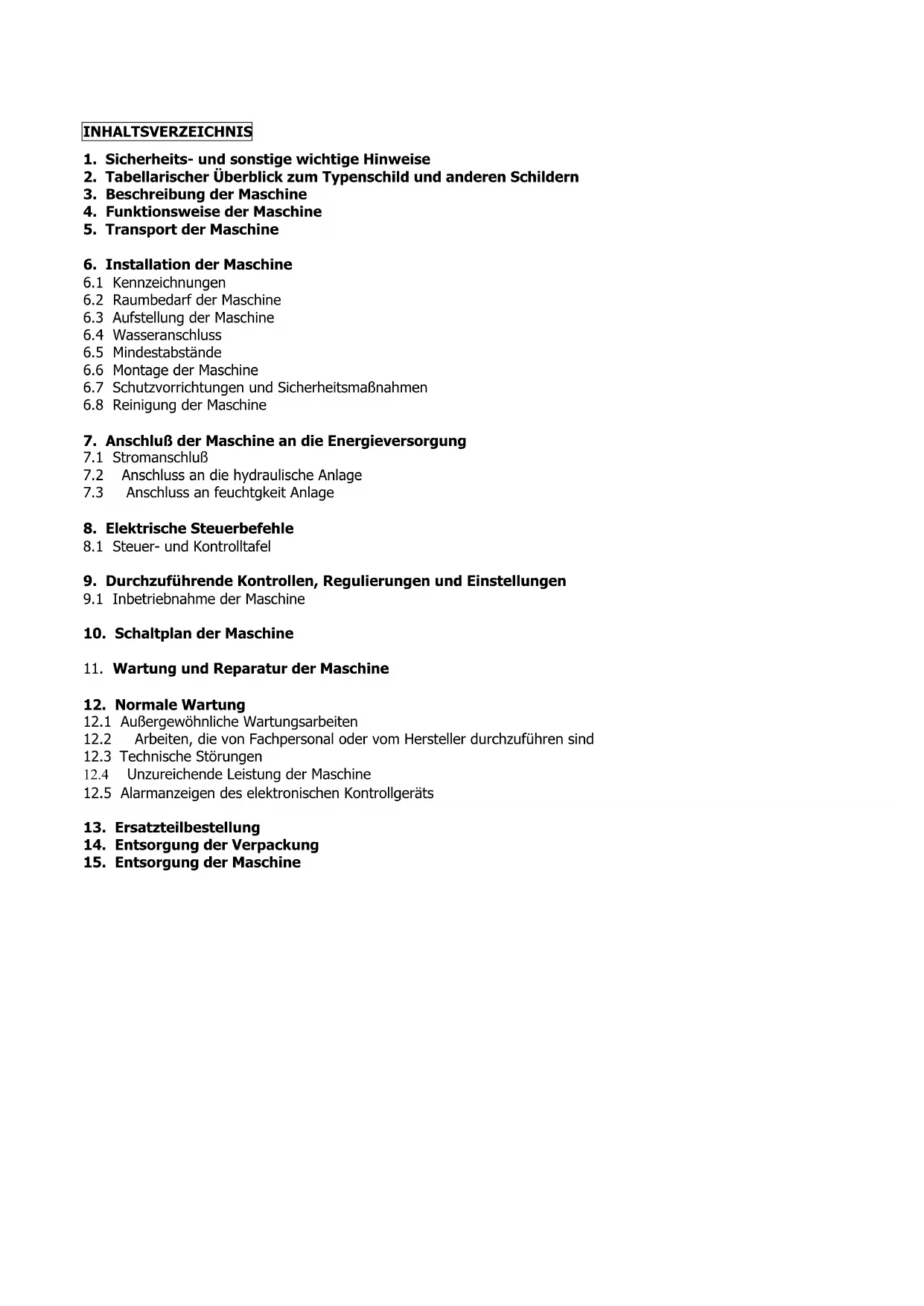Arbeiten, die von Fachpersonal oder vom Hersteller durchzuführen sind Im folgenden sind die Wartungsarbeiten aufgeführt, die ein gründliches technisches Fachwissen erfordern und daher nur von Fachpersonal oder vom Hersteller durchzuführen sind. Unter keinen Umständen vom Benutzer vorzunehmen sind der Austausch von Elektrozubehör, Änderungen an der elektrischen Anlage, Reparaturen der mechanischen Teile, Änderungen am Kühlsystem, Änderungen an der Steuertafel, an den Schaltern für Betrieb, Aus und Not-Aus, Änderungen an Schutz- und Sicherheitsvorrichtungen
