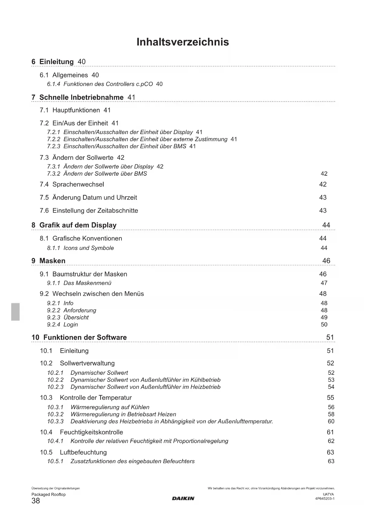 Wir behalten uns das Recht vor, ohne Vorankündigung Abänderungen am Projekt vorzunehmen.UATYA4P645203-1 9 MASKEN Über die Benutzeroberäche erhält man Zugri auf alle Informationen und die Einstellung der Parameter, die den Betrieb der Einheit betreen. Das Handbuch beschreibt, wie auf die relevanten Informationen und Parameter für die Einstellungen der verschiedenen Funktionen zugegrien werden kann.