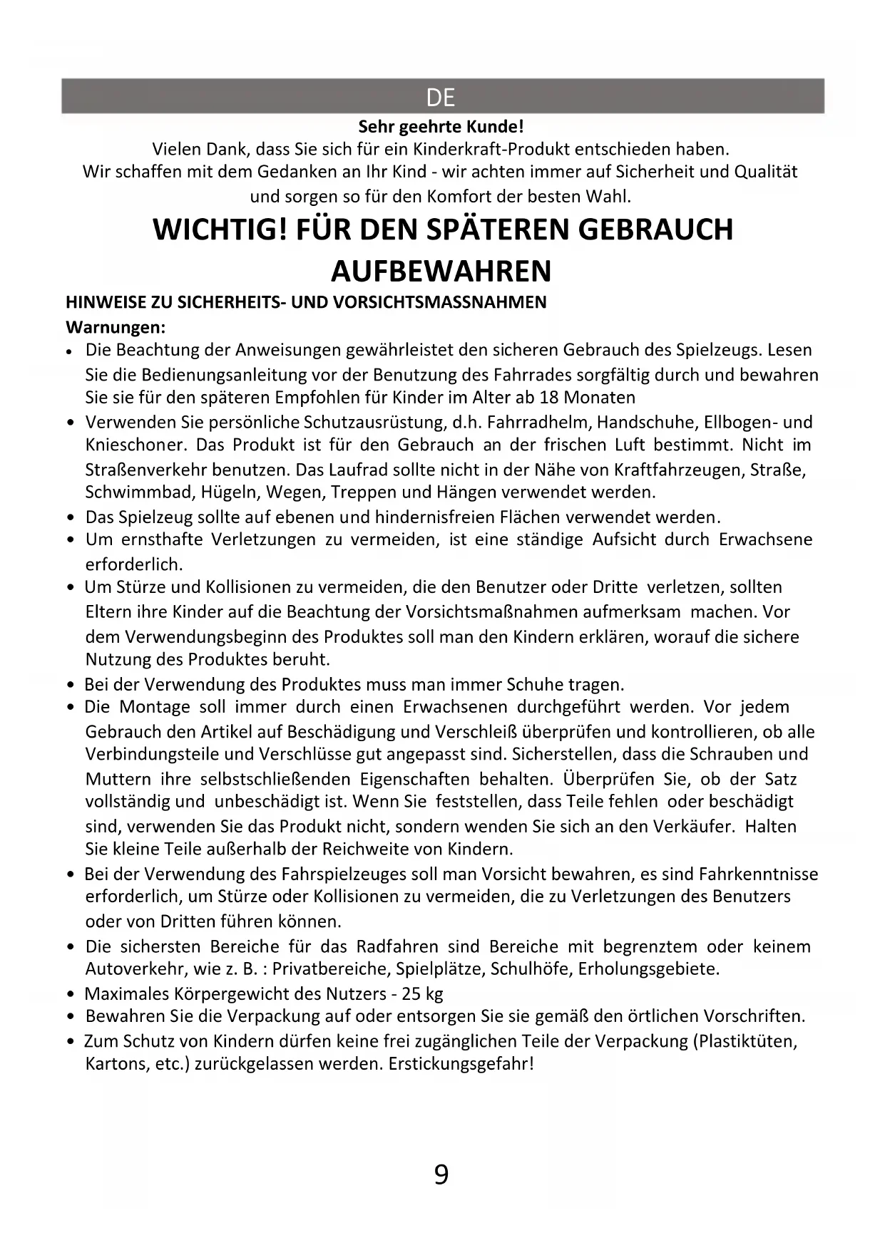 Sehr geehrte Kunde! Vielen Dank, dass Sie sich für ein Kinderkraft-Produkt entschieden haben. Wir schaffen mit dem Gedanken an Ihr Kind - wir achten immer auf Sicherheit und Qualität und sorgen so für den Komfort der besten Wahl. WICHTIG! FÜR DEN SPÄTEREN GEBRAUCH AUFBEWAHREN