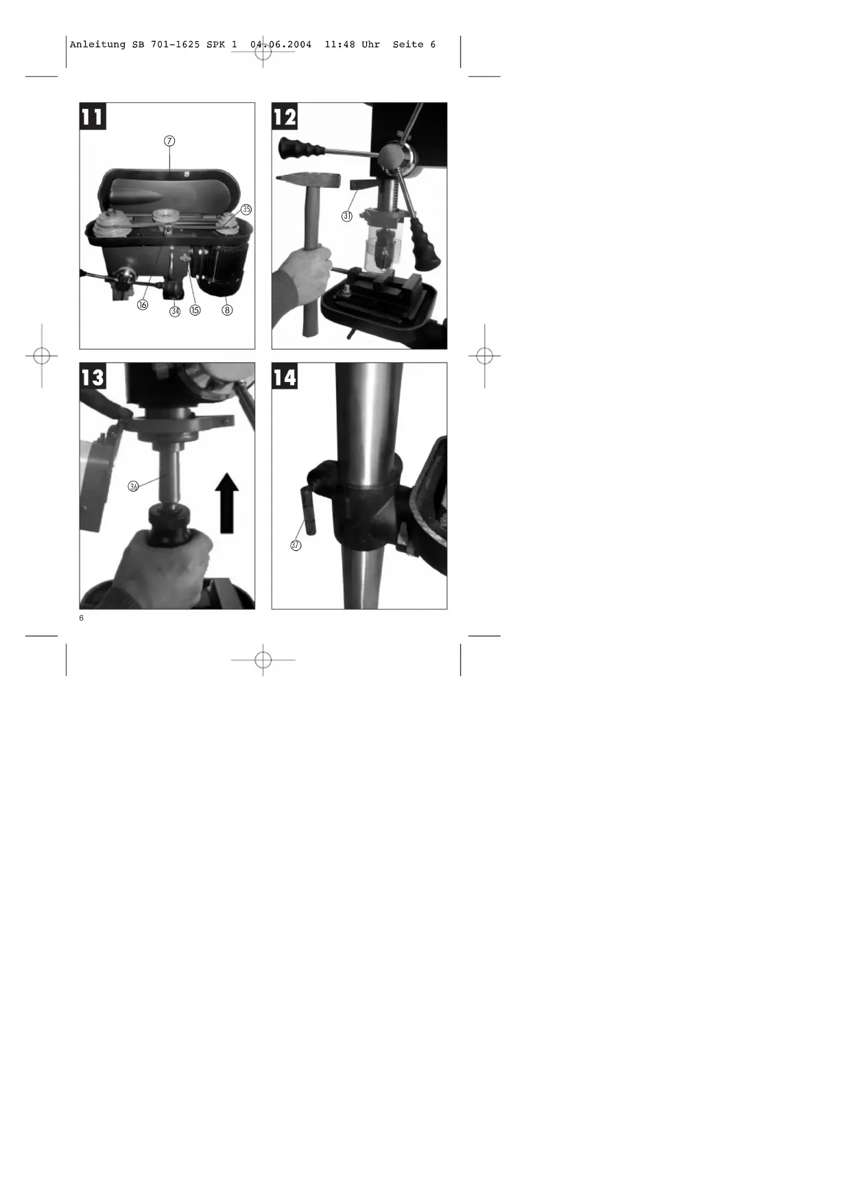 (SB 701/1) Ihre Säulenbohrmaschine SB 701/1 ist mit einem Zahnbohrfutter ausgestattet. Um einen Bohrer einzu- setzen, ist zuerst der Späneschutz (13) nach oben zu klappen, anschließend der Bohrer einzusetzen Anleitung SB 701-1625 SPK 1 04.06.2004 11:48 Uhr Seite 910