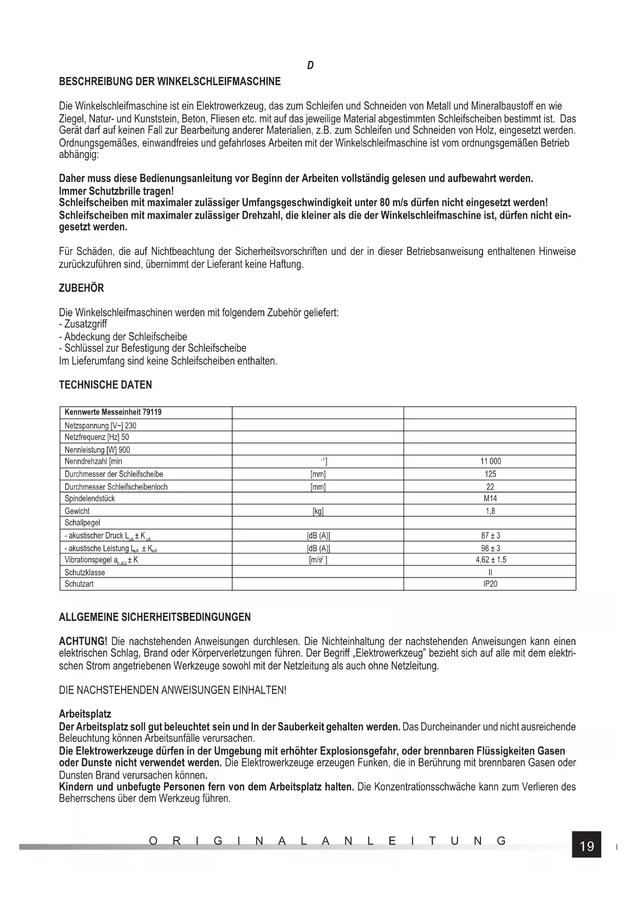 Die Winkelschleifmaschine ist ein Elektrowerkzeug, das zum Schleifen und Schneiden von Metall und Mineralbaustoff en wie Ziegel, Natur- und Kunststein, Beton, Fliesen etc. mit auf das jeweilige Material abgestimmten Schleifscheiben bestimmt ist. Das Gerät darf auf keinen Fall zur Bearbeitung anderer Materialien, z.B. zum Schleifen und Schneiden von Holz, eingesetzt werden. Ordnungsgemäßes, einwandfreies und gefahrloses Arbeiten mit der Winkelschleifmaschine ist vom ordnungsgemäßen Betrieb abhängig: Daher muss diese Bedienungsanleitung vor Beginn der Arbeiten vollständig gelesen und aufbewahrt werden. Immer Schutzbrille tragen! Schleifscheiben mit maximaler zulässiger Umfangsgeschwindigkeit unter 80 m/s dürfen nicht eingesetzt werden! Schleifscheiben mit maximaler zulässiger Drehzahl, die kleiner als die der Winkelschleifmaschine ist, dürfen nicht ein- gesetzt werden. Für Schäden, die auf Nichtbeachtung der Sicherheitsvorschriften und der in dieser Betriebsanweisung enthaltenen Hinweise zurückzuführen sind, übernimmt der Lieferant keine Haftung. ZUBEHÖR Die Winkelschleifmaschinen werden mit folgendem Zubehör geliefert: - Zusatzgriff - Abdeckung der Schleifscheibe - Schlüssel zur Befestigung der Schleifscheibe Im Lieferumfang sind keine Schleifscheiben enthalten. TECHNISCHE DATEN Kennwerte Messeinheit 79119 Netzspannung [V~] 230 Netzfrequenz [Hz] 50 Nennleistung [W] 900 Nenndrehzahl [min