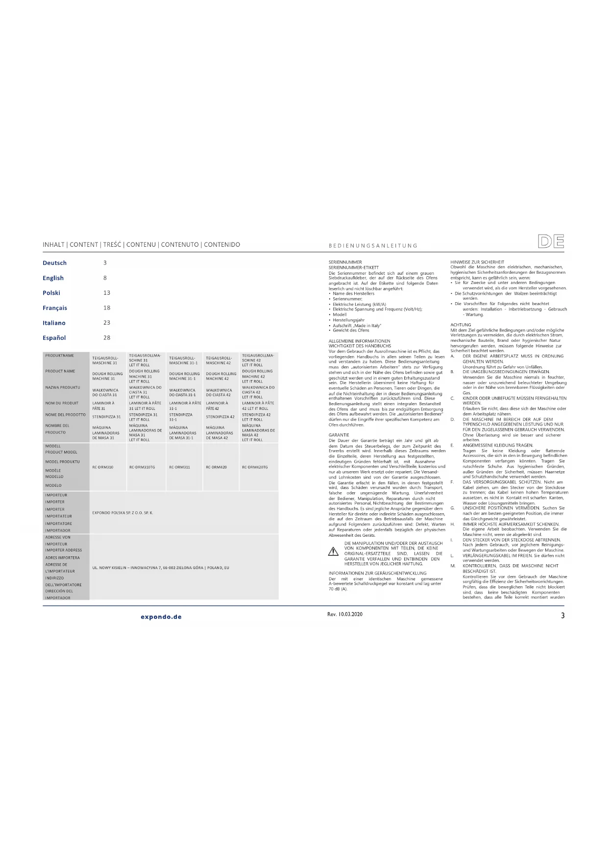 GARANTIE VERFALLEN UND ENTBINDEN DEN HERSTELLER VON JEGLICHER HAFTUNG.INFORMATIONEN ZUR GERÄUSCHENTWICKLUNG Der mit einer identischen Maschine gemessene A-bewertete Schalldruckpegel war konstant und lag unter 70 dB (A).HINWEISE ZUR SICHERHEITObwohl die Maschine den elektrischen, mechanischen, hygienischen Sicherheitsanforderungen der Bezugsnormen entspricht, kann es gefährlich sein, wenn:• Sie für Zwecke und unter anderen Bedingungen verwendet wird, als die vom Hersteller vorgesehenen.• Die Schutzvorrichtungen der Walzen beeinträchtigt werden.• Die Vorschriften für Folgendes nicht beachtet werden: Installation - Inbetriebsetzung - Gebrauch - Wartung.ACHTUNGMit dem Ziel gefährliche Bedingungen und/oder mögliche Verletzungen zu vermeiden, die durch elektrischen Strom, mechanische Bauteile, Brand oder hygienischer Natur hervorgerufen werden, müssen folgende Hinweise zur Sicherheit beachtet werden.A. DER EIGENE ARBEITSPLATZ MUSS IN ORDNUNG GEHALTEN WERDEN. Unordnung führt zu Gefahr von Unfällen.B. DIE UMGEBUNGSBEDINGUNGEN ERWÄGEN. Verwenden Sie die Maschine niemals in feuchter, nasser oder unzureichend beleuchteter Umgebung oder in der Nähe von brennbaren Flüssigkeiten oder Gas. C. KINDER ODER UNBEFUGTE MÜSSEN FERNGEHALTEN WERDEN. Erlauben Sie nicht, dass diese sich der Maschine oder dem Arbeitsplatz nähern.D. DIE MASCHINE IM BEREICH DER AUF DEM TYPENSCHILD ANGEGEBENEN LEISTUNG UND NUR FÜR DEN ZUGELASSENEN GEBRAUCH VERWENDEN. Ohne Überlastung wird sie besser und sicherer arbeiten.E. ANGEMESSENE KLEIDUNG TRAGEN. Tragen Sie keine Kleidung oder atternde Accessoires, die sich in den in Bewegung bendlichen Komponenten verfangen könnten. Tragen Sie rutschfeste Schuhe. Aus hygienischen Gründen, außer Gründen der Sicherheit, müssen Haarnetze und Schutzhandschuhe verwendet werden.F. DAS VERSORGUNGSKABEL SCHÜTZEN. Nicht am Kabel ziehen, um den Stecker von der Steckdose zu trennen; das Kabel keinen hohen Temperaturen aussetzen, es nicht in Kontakt mit scharfen Kanten, Wasser oder Lösungsmitteln bringen. G. UNSICHERE POSITIONEN VERMEIDEN. Suchen Sie nach der am besten geeigneten Position, die immer das Gleichgewicht gewährleistet.H. IMMER HÖCHSTE AUFMERKSAMKEIT SCHENKEN. Die eigene Arbeit beobachten. Verwenden Sie die Maschine nicht, wenn sie abgelenkt sind.I. DEN STECKER VON DER STECKDOSE ABTRENNEN. Nach jedem Gebrauch, vor jeglichem Reinigungs- und Wartungsarbeiten oder Bewegen der Maschine.L. VERLÄNGERUNGSKABEL IM FREIEN. Sie dürfen nicht verwendet werden.M. KONTROLLIEREN, DASS DIE MASCHINE NICHT BESCHÄDIGT IST. Kontrollieren Sie vor dem Gebrauch der Maschine sorgfältig die Ezienz der Sicherheitsvorrichtungen. Prüfen, dass die beweglichen Teile nicht blockiert sind, dass keine beschädigten Komponenten bestehen, dass alle Teile korrekt montiert wurden Rev. 10.03.2020 PRODUKTNAMETEIGAUSROLL-MASCHINE 31TEIGAUSROLLMA-SCHINE 31LET IT ROLLTEIGAUSROLL-MASCHINE 31-1TEIGAUSROLL-MASCHINE 42TEIGAUSROLLMA-SCHINE 42LET IT ROLLPRODUCT NAMEDOUGH ROLLING MACHINE 31DOUGH ROLLING MACHINE 31LET IT ROLLDOUGH ROLLING MACHINE 31-1DOUGH ROLLING MACHINE 42DOUGH ROLLING MACHINE 42LET IT ROLLNAZWA PRODUKTUWAŁKOWNICA DO CIASTA 31WAŁKOWNICA DO CIASTA 31LET IT ROLLWAŁKOWNICA DO CIASTA 31-1WAŁKOWNICA DO CIASTA 42WAŁKOWNICA DO CIASTA 42LET IT ROLLNOM DU PRODUIT LAMINOIR À PÂTE 31LAMINOIR À PÂTE 31 LET IT ROLLLAMINOIR À PÂTE 31-1 LAMINOIR À PÂTE 42LAMINOIR À PÂTE 42 LET IT ROLLNOME DEL PRODOTTOSTENDIPIZZA 31STENDIPIZZA 31 LET IT ROLLSTENDIPIZZA 31-1 STENDIPIZZA 42STENDIPIZZA 42 LET IT ROLLNOMBRE DEL PRODUCTOMÁQUINA LAMINADORAS DE MASA 31MÁQUINA LAMINADORAS DE MASA 31LET IT ROLLMÁQUINA LAMINADORAS DE MASA 31-1MÁQUINA LAMINADORAS DE MASA 42MÁQUINA LAMINADORAS DE MASA 42LET IT ROLLMODELL RC-DRM310 RC-DRM310TG RC-DRM311 RC-DRM420 RC-DRM420TG PRODUCT MODELMODEL PRODUKTUMODÈLEMODELLOMODELOIMPORTEUREXPONDO POLSKA SP. Z O.O. SP. K.IMPORTERIMPORTERIMPORTATEUR IMPORTATOREIMPORTADORADRESSE VON IMPORTEURUL. NOWY KISIELIN – INNOWACYJNA 7, 66-002 ZIELONA GÓRA | POLAND, EUIMPORTER ADDRESSADRES IMPORTERAADRESSE DE L'IMPORTATEUR INDIRIZZO DELL'IMPORTATOREDIRECCIÓN DEL IMPORTADOR54 DEDE und dass alle Bedingungen, die die ordnungsgemäße Funktionsweise der Maschine beeinussen könnten, optimal sind.