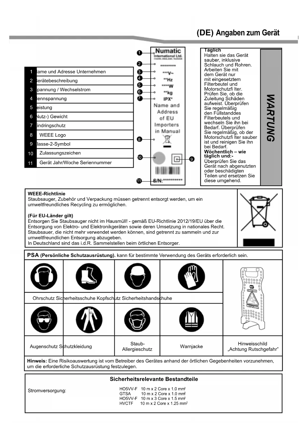 Under any circumstances place foreign objects including (but not limited to) air fresheners, air freshener capsules or scented beads of any type into the top fi lter of the machine. Doing so can be dangerous and risk damage to the machine and may invalidate the machine warranty.Fault Finding Dry Mode maintenance/fault fi nding If the vacuum cleaner stops working switch o and remove the plug from the wall before investigating were the fault lies. If the vacuum cleaner will not pick up any debris from the surface, switch o and remove the plug from the wall, inspect the fl oor tool, wands and hose for blockages, if no blockages are found, the dust bag may be full if the dust bag is not full the fi lter may be blocked. Wet mode If the vacuum cleaner stops working switch o and remove the plug from the wall before investigating were the fault lies. If the vacuum cleaner has a blockage and will not pick up liquid, switch o and remove the plug from the wall, has the fl oat valve operated, this will shut o the suction and the pitch of the vacuum motor will change. Remove the power head and empty the liquid out of the container, if the container is empty, check that the fl oor tool wands and hose are not blocked. Flush the system with clean water after use. After use always inspect the machine for damage.PSA (Persönliche Schutzausrüstung). kann für bestimmte Verwendung des Geräts erforderlich sein. Ohrschutz Sicherheitsschuhe Kopfschutz Sicherheitshandschuhe Augenschutz Schutzkleidung Staub- Allergieschutz Warnjacke Hinweisschild „Achtung Rutschgefahr” Hinweis: Eine Risikoauswertung ist vom Betreiber des Gerätes anhand der örtlichen Gegebenheiten vorzunehmen, um die erforderliche Schutzausrüstung festzulegen. Sicherheitsrelevante Bestandteile Stromversorgung: WEEE-Richtlinie Staubsauger, Zubehör und Verpackung müssen getrennt entsorgt werden, um ein umweltfreundliches Recycling zu ermöglichen. (Für EU-Länder gilt) Entsorgen Sie Staubsauger nicht im Hausmüll! - gemäß EU-Richtlinie 2012/19/EU über die Entsorgung von Elektro- und Elektronikgeräten sowie deren Umsetzung in nationales Recht. Staubsauer, die nicht mehr verwendet werden können, sind getrennt zu sammeln und zur umweltfreundlichen Entsorgung abzugeben. In Deutschland sind das i.d.R. Sammelstellen beim örtlichen Entsorger. (DE) Angaben zum Gerät 1 Name und Adresse Unternehmen 2 Gerätebeschreibung 3 Spannung / Wechselstrom 4 Nennspannung 5 Leistung 6 (Nutz-) Gewicht 7 Eindringschutz