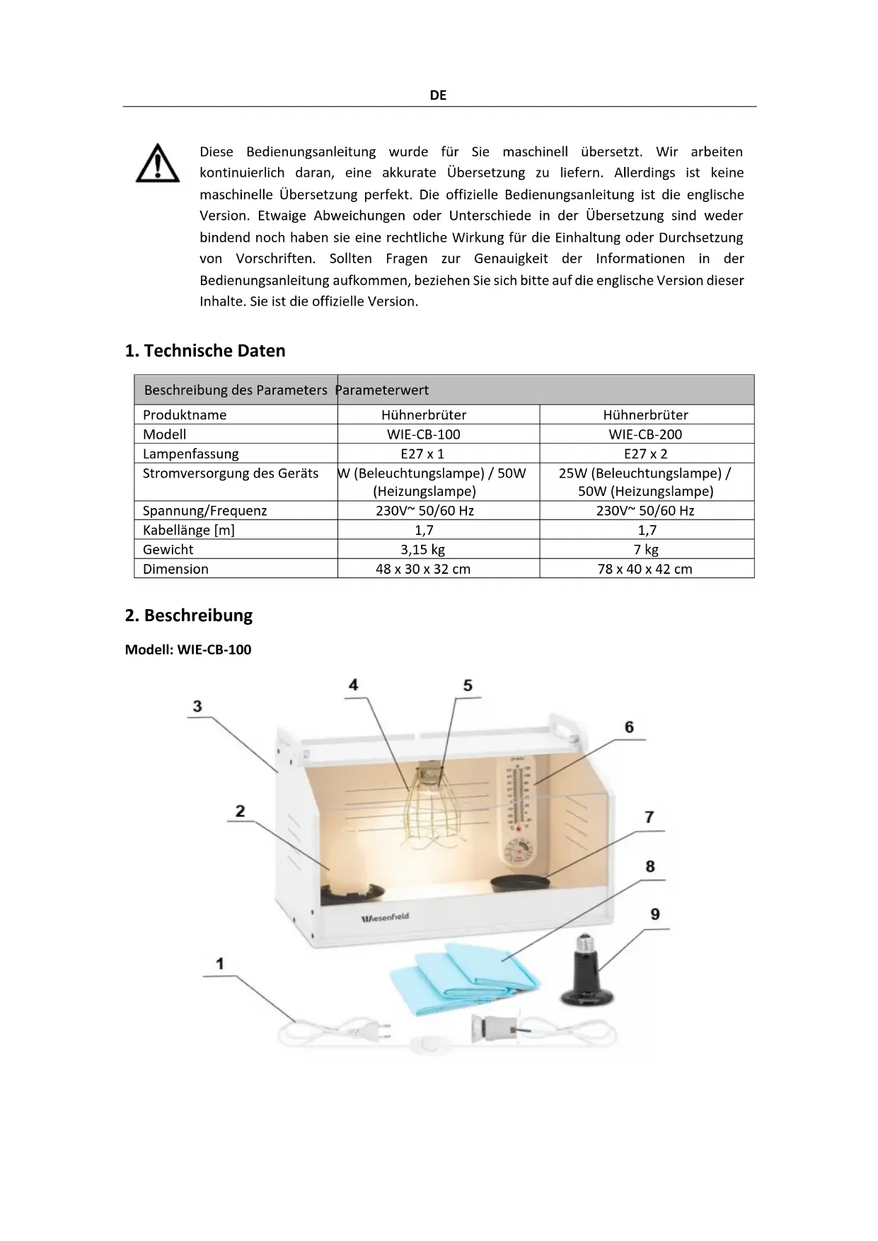 Ime izdelka Zabojiček za vzrejo piščancev DE Modell | EN Product model | PL Model produktu | CZ Model výrobku | FR Modèle | IT Modello | ES Modelo | HU Modell | DA Model | FI Tuotteen malli | NL Productmodel | NO Produktmodell | SE Produktmodell | PT Modelo do produto | SK Model | BG Модел на продукт | EL Μοντέλο προϊόντος | HR Model proizvoda | LT: Gaminio modelis | RO: Model de produs | SL: Model izdelka WIE-CB-100 WIE-CB-200 DE Hersteller | EN Manufacturer | PL Producent | CZ Výrobce | FR Fabricant | IT Produttore | ES Fabricante | HU Termelő | DA Producent | FI Valmistaja | NL Producent | NO Produsent | SE Tillverkare | PT Fabricante | SK Výrobca | BG Производител | EL Κατασκευαστής | HR Proizvođač | LT Gamintojas | RO Producător | SL Proizvajalec expondo Polska sp. z o.o. sp. k. DE Anschrift des Herstellers | EN Manufacturer Address | PL Adres producenta | CZ Adresa výrobce | FR Adresse du fabricant | IT Indirizzo del produttore | ES Dirección del fabricante | HU A gyártó címe | DA Producentens adresse | FI Valmistajan osoite | NL Adres producent | NO Produsentens adresse | SE Tillverkarens adress | PT Endereço do fabricante | SK Adresa výrobcu | BG Адрес на производителя | EL: Διεύθυνση κατασκευαστή | HR Adresa proizvođača | LT Gamintojo adresas | RO Adresa producătorului | SL Naslov proizvajalca ul. Nowy Kisielin – Innowacyjna 7, 66-002 Zielona Góra | Poland, EUDE Diese Bedienungsanleitung wurde für Sie maschinell übersetzt. Wir arbeiten kontinuierlich daran, eine akkurate Übersetzung zu liefern. Allerdings ist keine maschinelle Übersetzung perfekt. Die offizielle Bedienungsanleitung ist die englische Version. Etwaige Abweichungen oder Unterschiede in der Übersetzung sind weder bindend noch haben sie eine rechtliche Wirkung für die Einhaltung oder Durchsetzung von Vorschriften. Sollten Fragen zur Genauigkeit der Informationen in der Bedienungsanleitung aufkommen, beziehen Sie sich bitte auf die englische Version dieser Inhalte. Sie ist die offizielle Version.