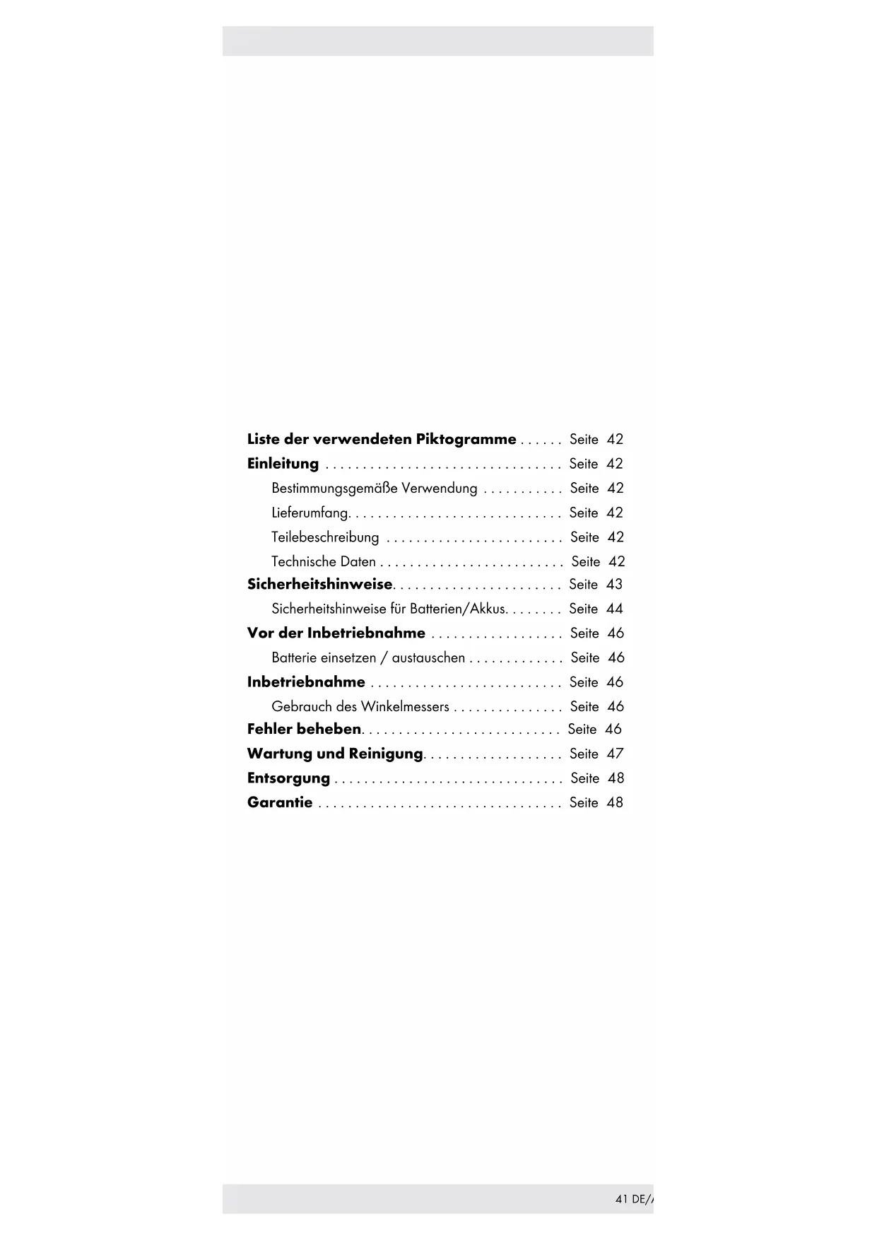 Aufhängung Technische Daten Messgrößeneinheit: Grad (°) Messbereich: 0 bis 360° Auflösung: 0,1° Genauigkeit: ± 0,3° Messsystem: lineares, kontaktloses CAP-Messsystem Anzeige: LC D - Anzeige Betriebstemperatur: +5 °C bis +40 °C Einfluss durch Luftfeuchtigkeit: innerhalb von 0 % bis 80 % relative Luftfeuchtigkeit unerheblich Batterie: 3 V CR2032 (im Lieferumfang enthalten)43 DE/AT/CH Sicherheitshinweise